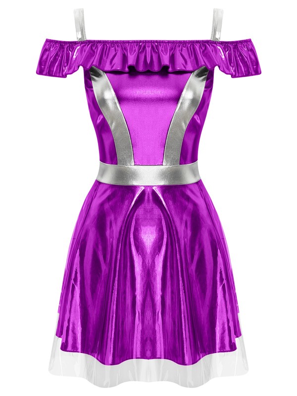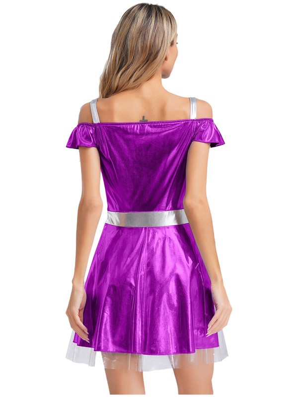 Cami dress styled alien costume for women, cold shoulder, ruffle collar, a-line short dress with a transparent layer.