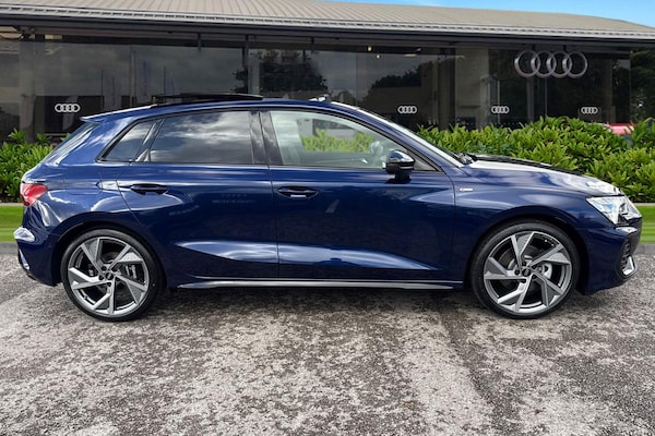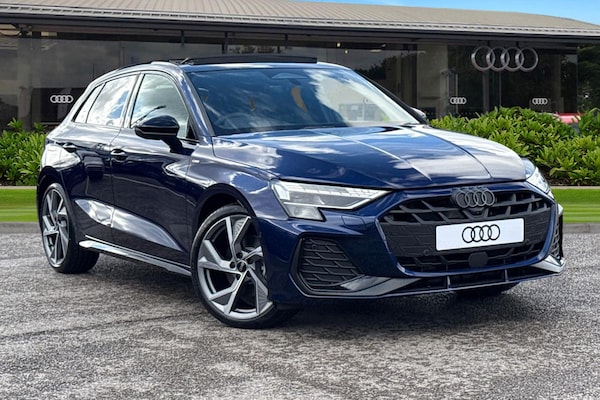 Vehicle price shown includes a deposit contribution of £2500 when purchased on finance by 31/03/2026. Solutions Personal Contract Plan. 7.9% APR Representative. Audi Financial Services. Terms and Conditions apply. Discount includes the Audi Retail Sales Event offer. Relax in the comfort of this Brand-New Audi A3 Sportback Black Edition in Navarra blue with its 19"" 5-Y-arm matt grey alloy wheels which look stunning out on the roads. The LED headlights with LED rear lights create that strong visibility in all weather conditions. This Audi A3 has some brilliant features, such as the heated front seats, which are perfect for those cooler mornings. The wireless phone charging point, makes fully charging or just topping up your phones battery on any journey, a breeze. This vehicle has some fantastic optional extras, such as the Tech pack pro which does include the panoramic glass sunroof which is perfect for those sunny days. It also includes the 360 degree camera which is great for maximising vision and to assist in all maneuvering situations. Safety and convenience is further enhanced by the head-up display, meaning that the driver can keep their eyes on the roads. Another wonderful extra is the Sonos sound system which creates that excellent sound experience for everyone to enjoy. The multimedia interface allows the driver and front passenger to access a range of different media, such as the driver assist which can be adjusted to your driving preference on all journe...
