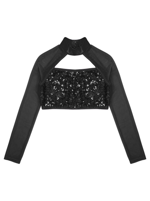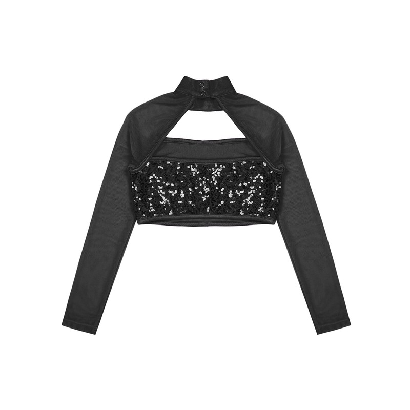 The top with spandex mesh long sleeve and round stand collar, button closure collar back, hollow front and back design.