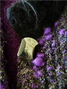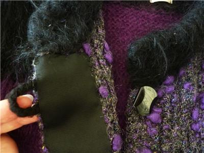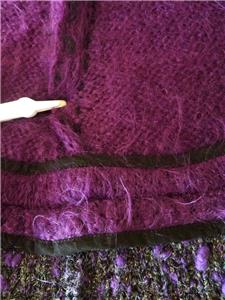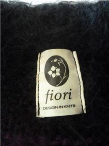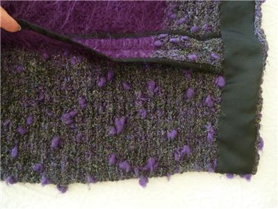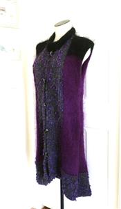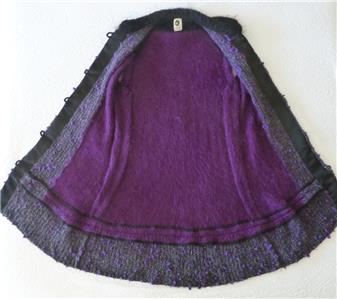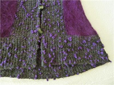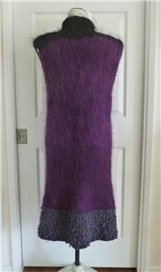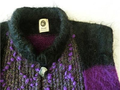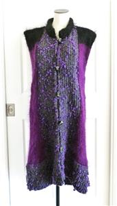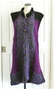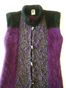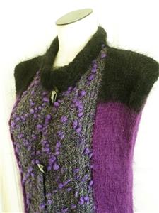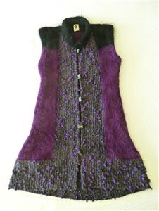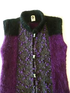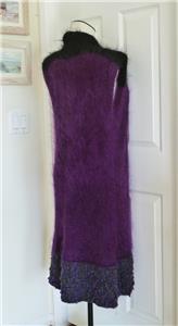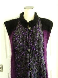 Fiori. Limited research shows this to be a rare piece from textile artist Gina Fiori, likely made in Great Britain in the 80s or 90s. Handwoven yarns appear to include mohair and wool. Long fur mohair in deep purple and black, accent knit in charcoal and rainbow metallic yarns with purple knotted balls (not sure of the correct term). Sleeveless, asymmetric long length, bottom flare, five artisan buttons with loop closures; looks great open or buttoned. Even the seams have been hand-sewn (photo #10). Check measurements below to see if will work for your desired fit. Excellent condition, no blemishes, a rare one-of-a-kind piece. Please review all 22 photos to fully appreciate.