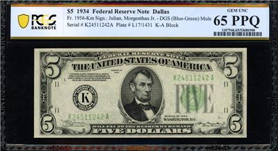 You are looking at a gorgeous 1934 $5 Federal Reserve Note from the ever popular Dallas district. This note is the micro/macro Mule variety, which is found with a macro-size backplate (BP #939 and higher). The Friedberg number is Fr. 1956-Km, and the signatures are Julian-Morgenthau. The serial number is K24511242A (K-A block).