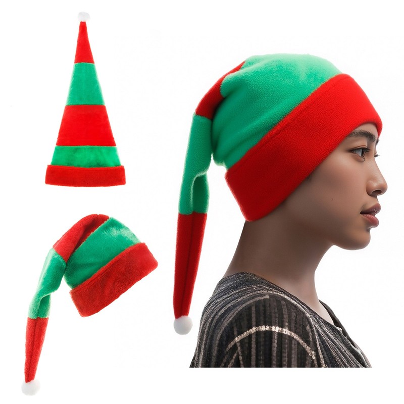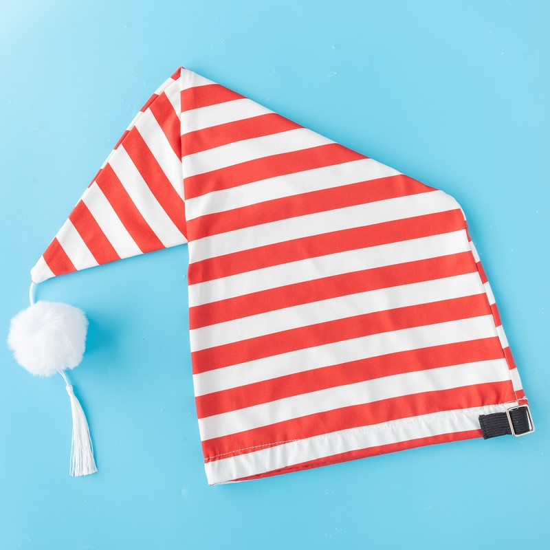 Striped Christmas sleeping cap in classic pointed design decorates with pompom ball and tassel on the top, full of Christmas sense.