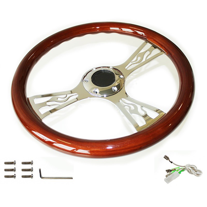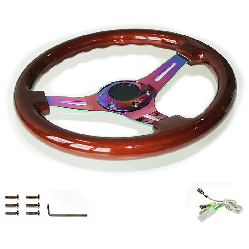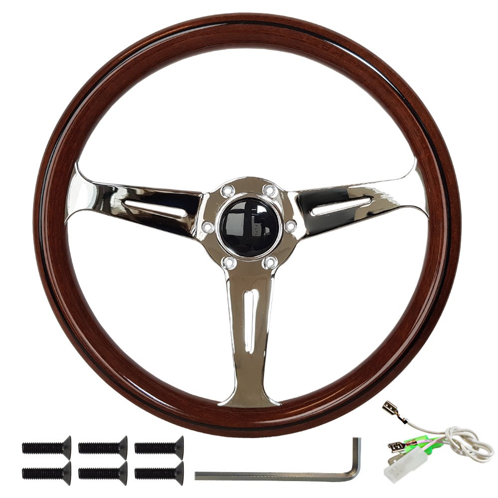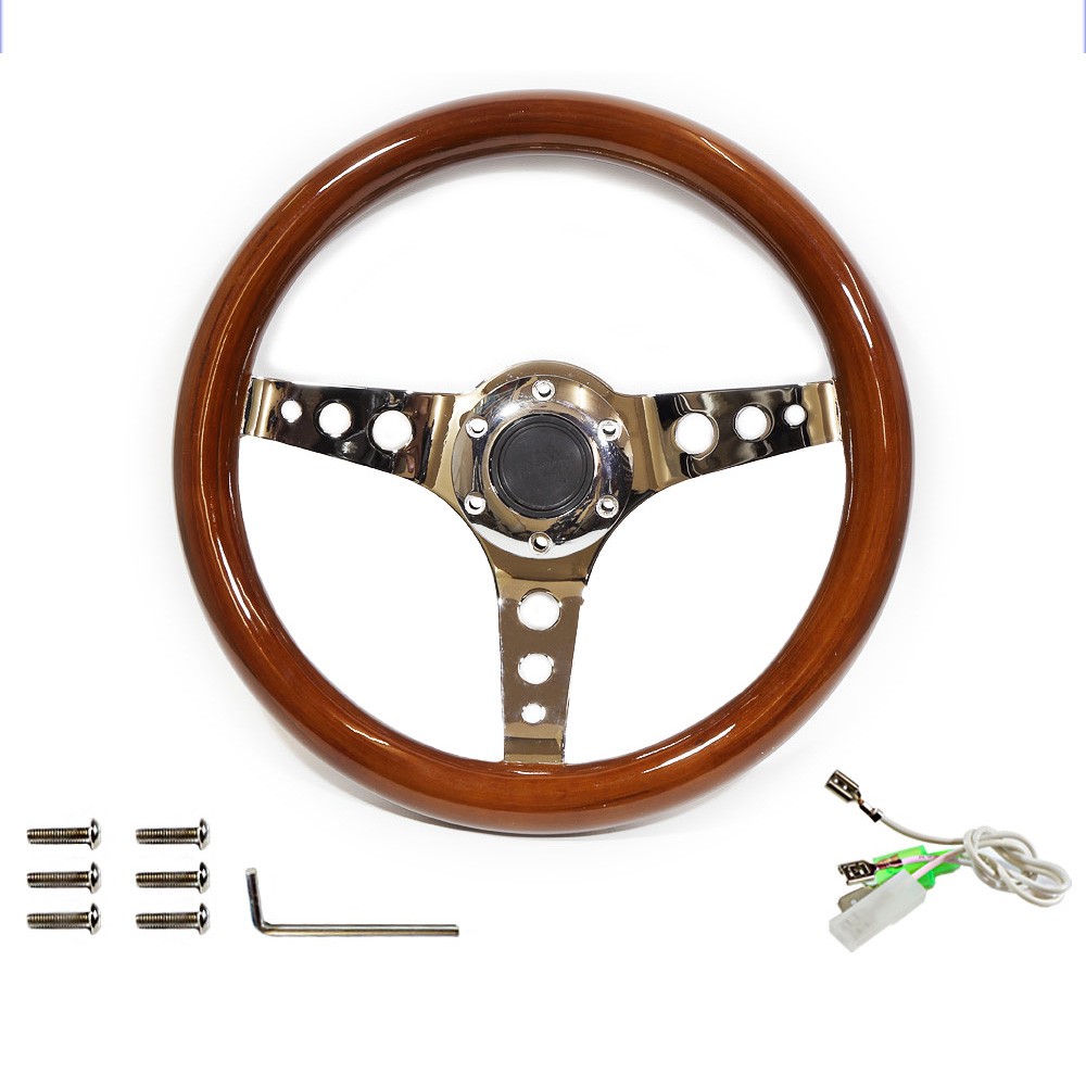 Vintage wooden steering wheel made of fine wood with chrome spokes. Very stylish appearance, great combination of real wood and chrome, real fine wood. Chrome beams are grooved. The wooden surface is of high quality, with very nice wood veins. The wooden surface is multi-layer lacquered and mirror polished. The surface on the back of the steering wheel crown is wavy, ensuring a perfect grip. Horn button and chrome screws are included.Loch Circuit: 70mm