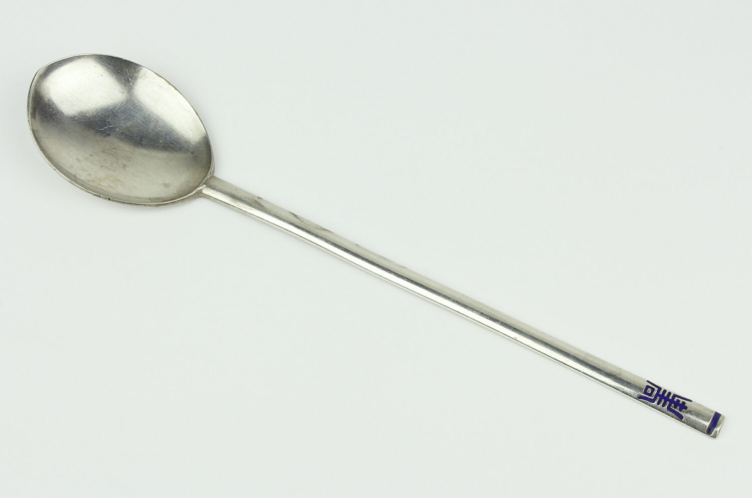 70% Silver Chinese rice spoon featuring a blue enamel design at the top. There are scratches and nicks on it, as pictured.