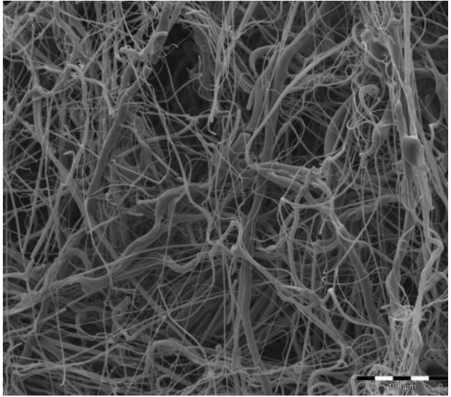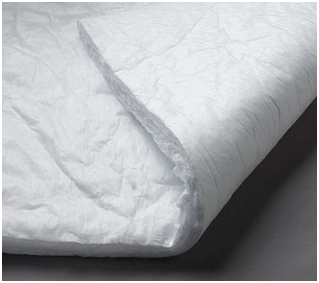 The web is composed of 50% polyester staple fibres, and 50% polypropylene fibres. The polypropylene fibres are extremely fine, producing the high-energy absorption characteristic with the low weight. The polyester fibres are added to strengthen the web. The scrim attached to both sides is a 100% polypropylene non-woven fabric.