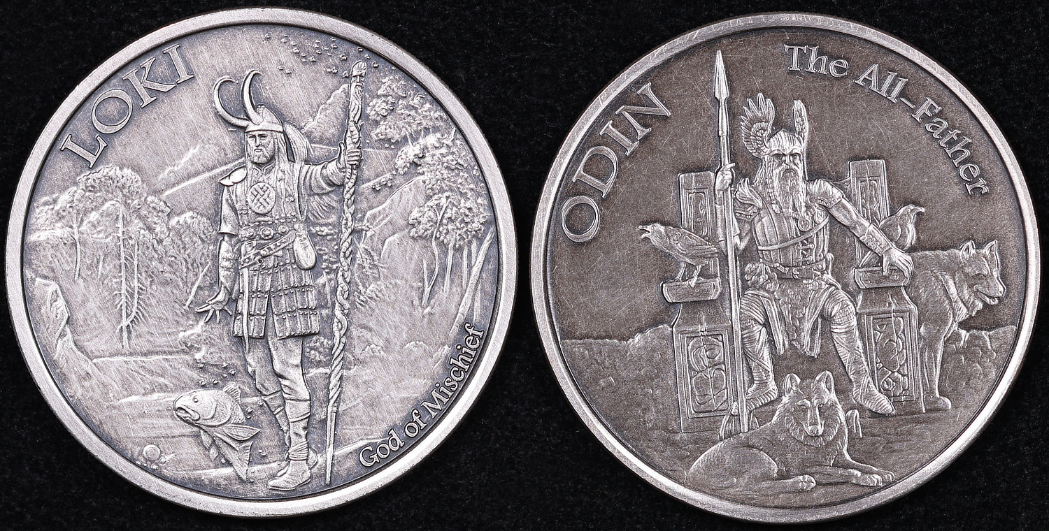 Norse God Series Loki & Odin 2 oz .999 Fine Silver Antiqued Art Round 2pc Set. This set features Loki the God of Mischief and Odin the All-Father both from the Norse God series. Minted by the Anonymous Mint both have a limited mintage of 2,000, with Odin being #1,691 and Loki being #1,413. Both will come with a COA and in a plastic capsule. A great addition to any buyer’s collection!