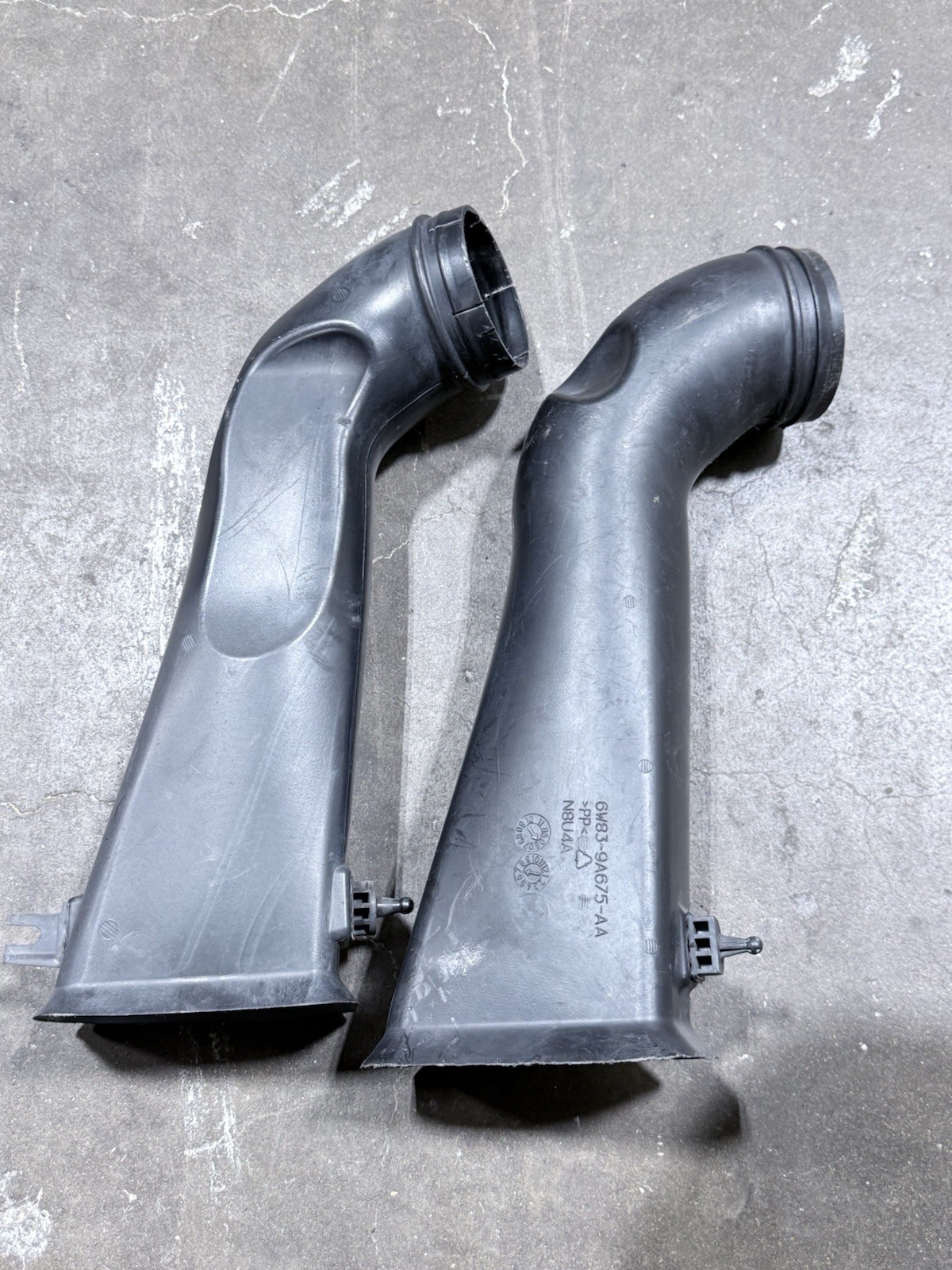 Good working condition. Complete set with MAF sensors. One duct that attaches to radiator support the very bottom one has a few drilled holes and slats cut out on the connector.