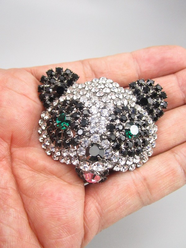 Up for sale is a wonderful vintage brooch designed by Chris Crouch for his designer jewelry label, "Moans Couture". The brooch is 2 1/8" long x 1 3/4" wide and has a dark gunmetal finish. The front is intricately set with clear, black, pink, and green rhinestones and the reverse has a secure pin assembly. It is in excellent condition and is marked "Moans" on the reverse.