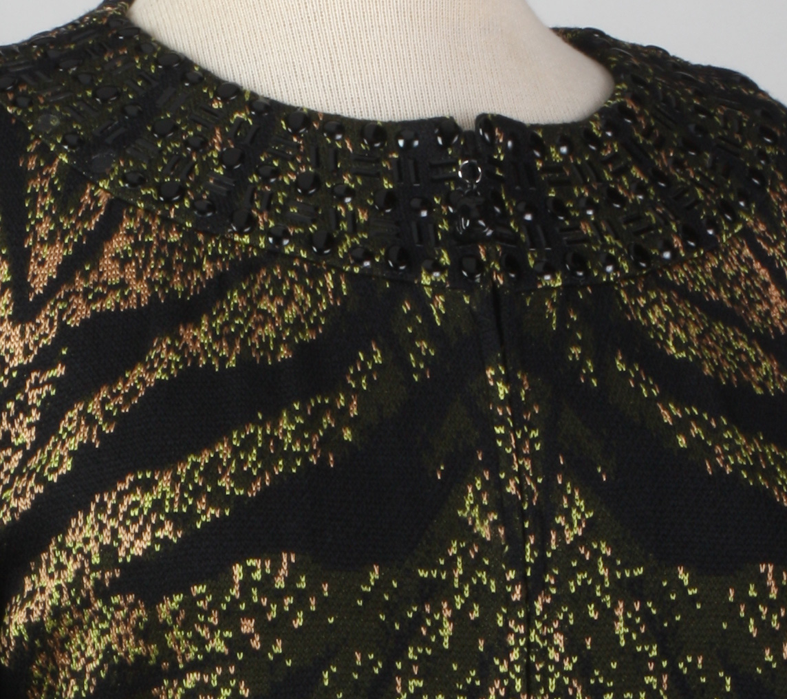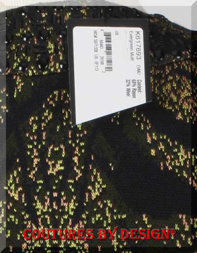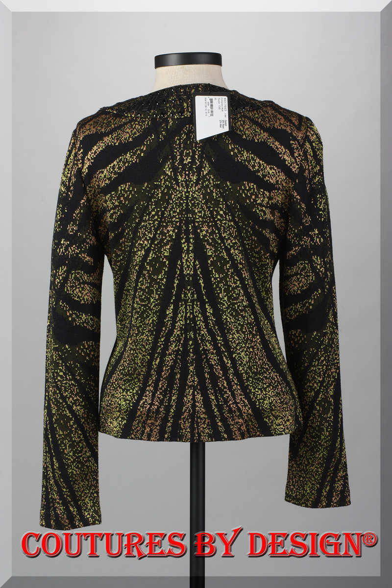 St John Knits Collection Long Sleeve Zip Front Santana Knit Hip Length Multi Evergreen Jacket. Graphic design in various green shades of greens and blacks. The jewel neckline is embellished with 5 rows of alternating oval beads and rectangular bars. There are over 100 beads on this jacket. Fabric Content is: 68% Rayon 32% Wool