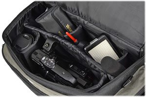 Made from durable nylon, and outfitted with a padded handle, this multi-compartment case will easily hold your DSLR camera or camcorder with attached lens, spare lenses, LED video light, flash, microphone and accessories. An oversized compartment and two gusseted side pockets with zippered closure, plus a large, front zippered pocket provide instant access to your most essential accessories.
