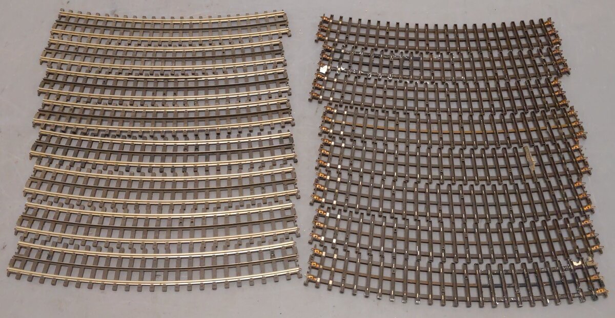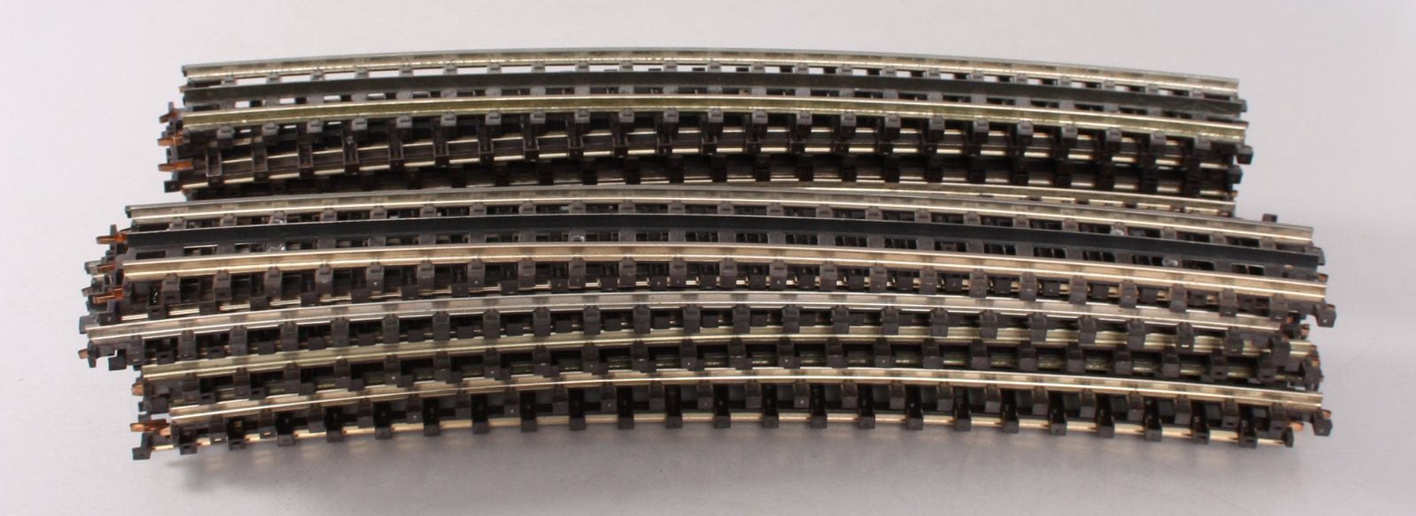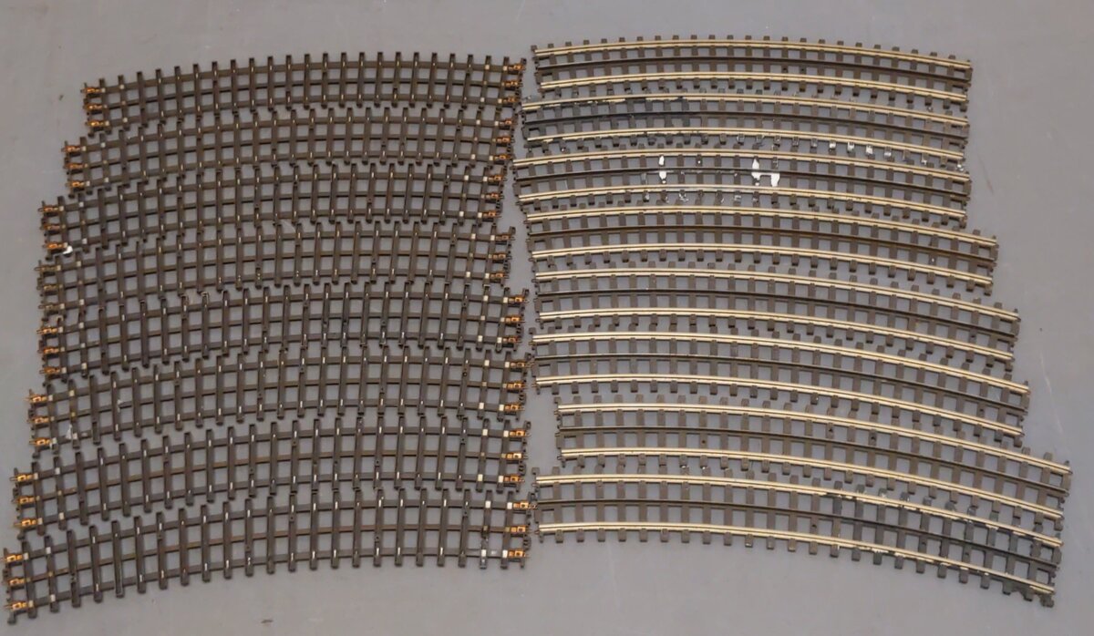 Here are 16 MTH 45-1010 ScaleTrax O72 Curved Track sections (16). Features include solid, nickel-silver rails, low profile appearance, and snaps together quickly and easily. These items feature plastic track construction and metal rail pieces.