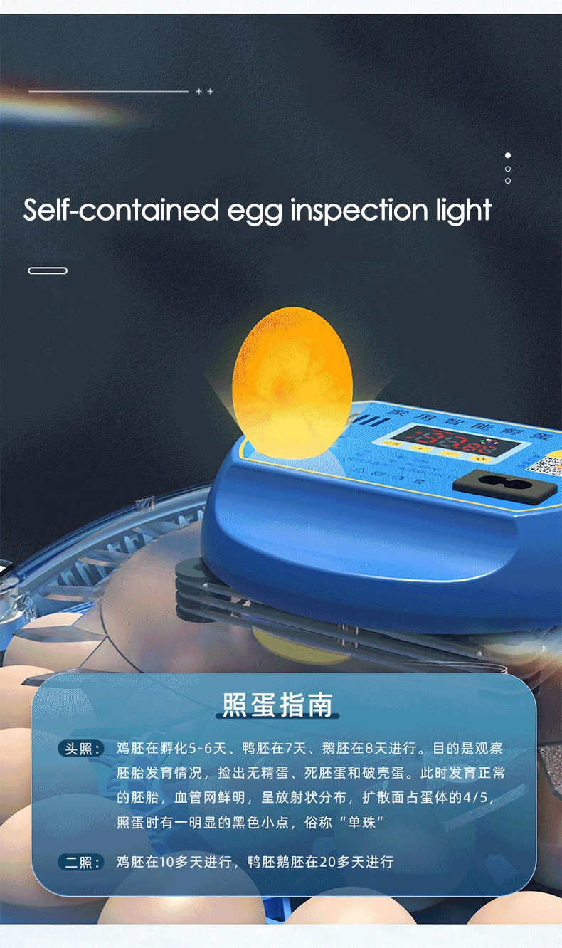 Egg Candling Guide Head Candling: Perform on chicken embryos at 5-6 days, duck embryos at 7 days, and goose embryos at 8 days. This observes embryonic development to identify infertile eggs, dead embryos, and cracked eggs. At this stage, a normally developing embryo exhibits: - A distinct vascular network radiating outward, covering 4/5 of the egg's surface - A clearly visible small black dot during candling, commonly known as the “single pearl” Second Candling: - For chicken embryos: performed around day 10 - For duck and goose embryos: performed around day 20