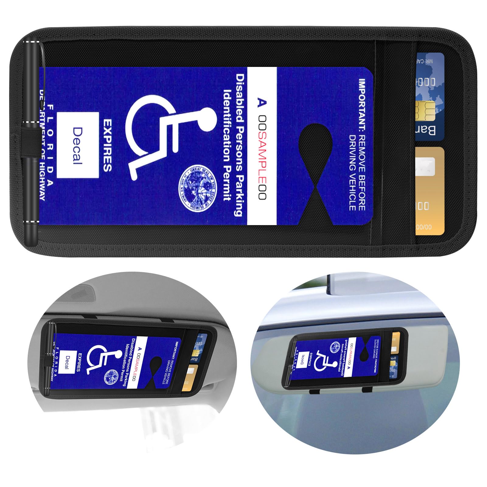 PRACTICAL: This disabled placard holder allows you to easily display your handicap placard and more on your car's sun visor, making it easy to access and use whenever you need it. The car visor placard clip can also be used to store pens, note paper, gas cards, charge cards, business cards, tickets, etc., so that your car cab interior environment is cleaner and tidier.