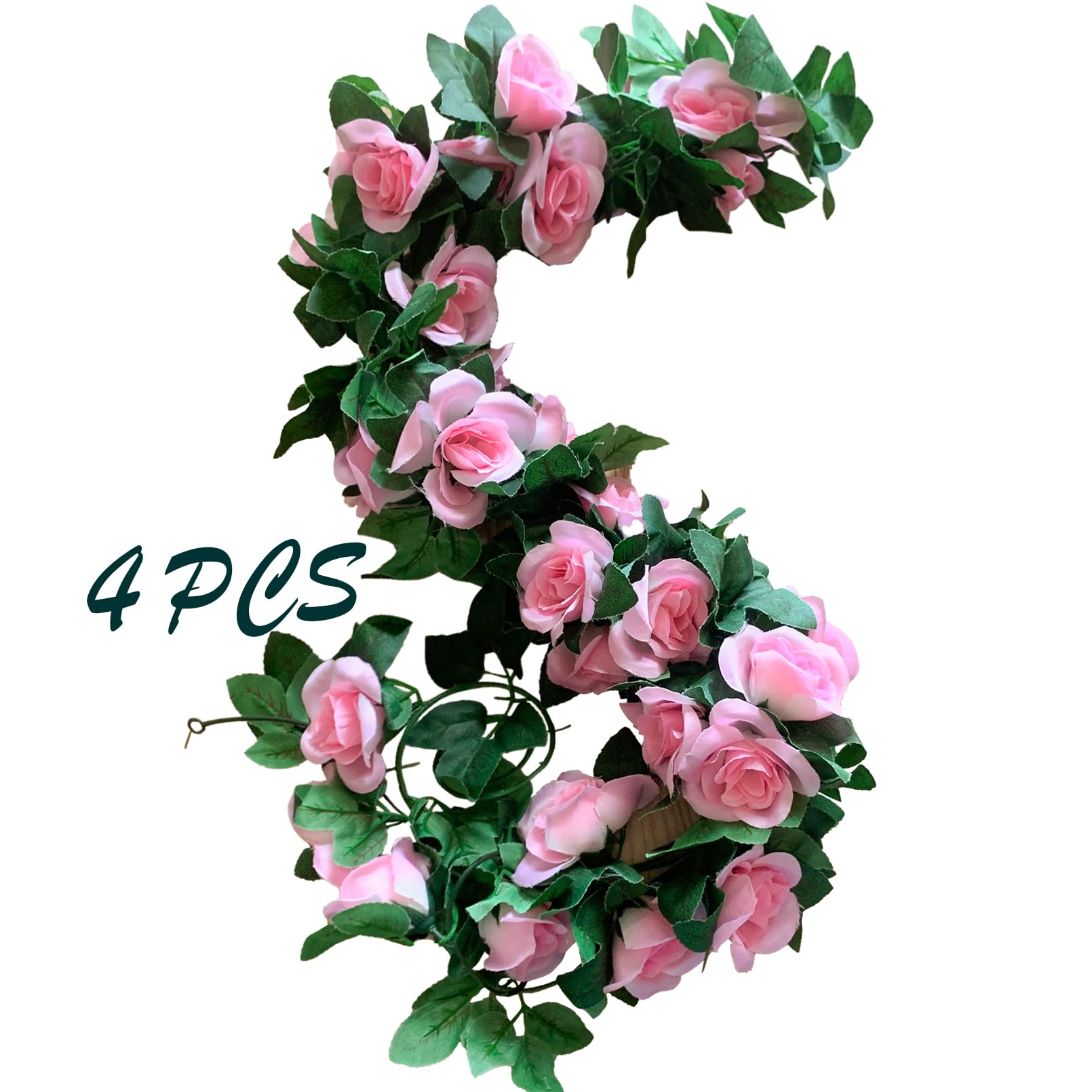 MUYG 4 Pack Artificial Rose Vine Garland Fake Roses Flowers Plants Vines Hanging Floral Leaves Decoration for Wedding Party Table Garden Arch Wall Home Room Decor(Pink)