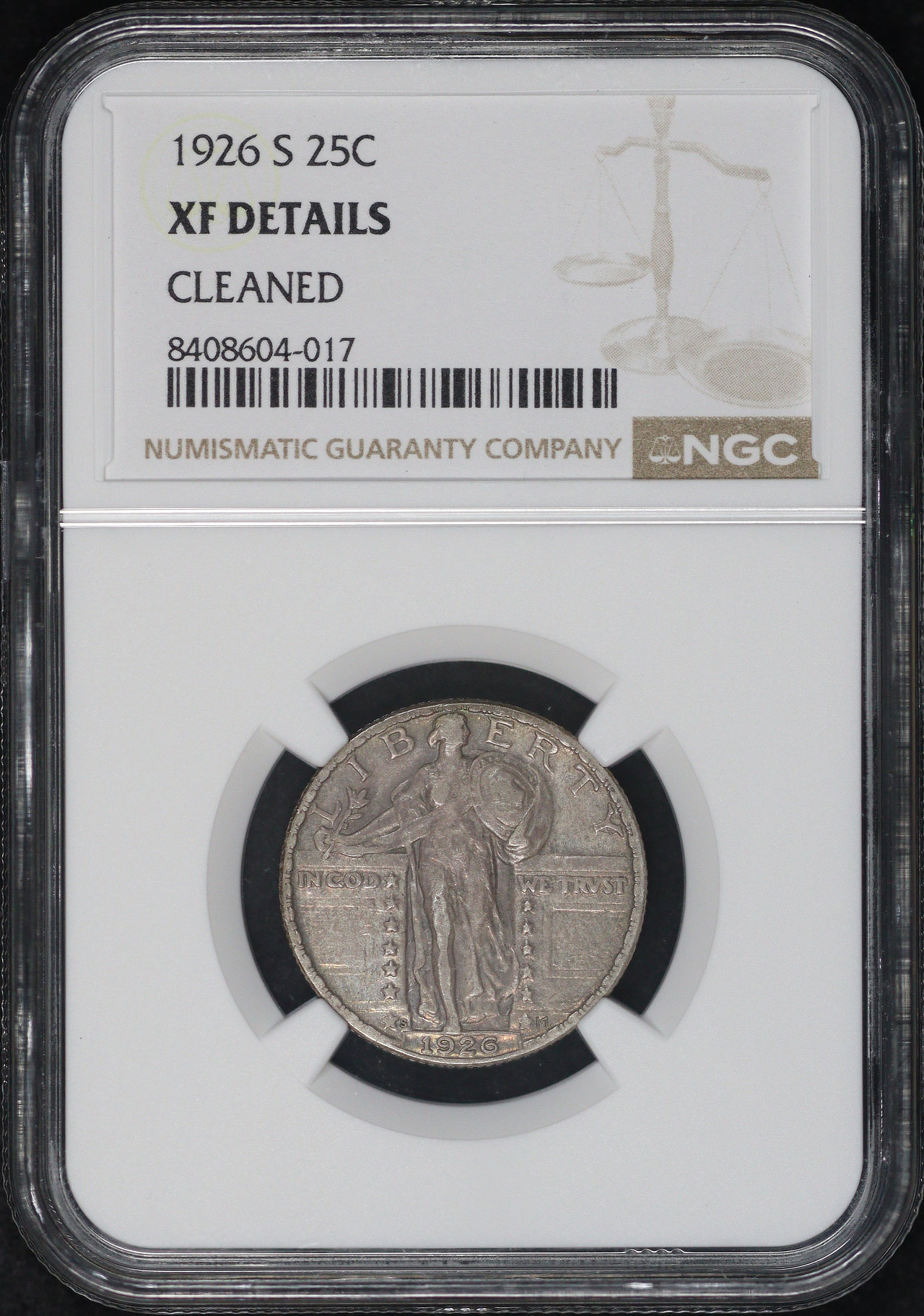 1926-S Standing Liberty Quarter NGC XF Details Cleaned. This coin has the given grade as a result of it having been improperly cleaned, showing faint hairlines, smoky toning, and glossy surfaces.