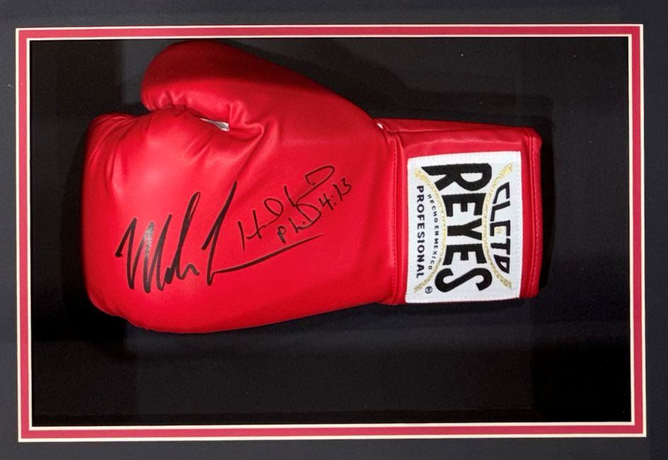 Featured is a Mike Tyson and Evander Holyfield signed Cleto Reyes boxing glove. This glove has been hand signed by Tyson and Holyfield and comes with the JSA witnessed hologram. This glove has been professionally framed and matted and is approximately 16x19x5. This glove would make a great addition to any sports memorabilia collection!.