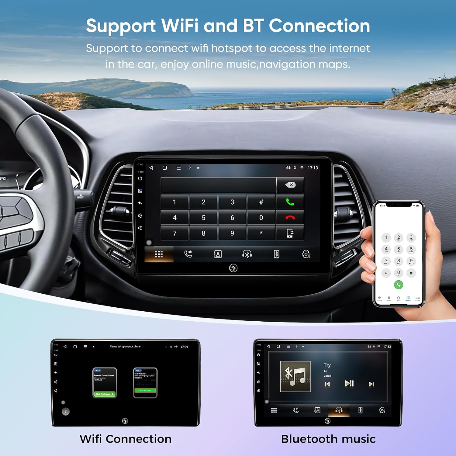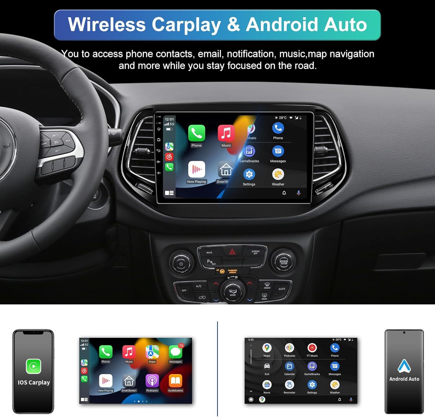 ● Wireless & Wired Android auto: wired or wireless Android auto in-vehicle system can closely integrate the user's Android device and Android experience with the dashboard system. Users who use wireless Android auto can connect to the car system via Bluetooth to realize voice-controlled navigation, make calls, send and receive messages, and listen to music. It is only available for Android phone(Android phones need to download android auto APP) .