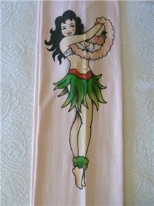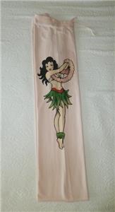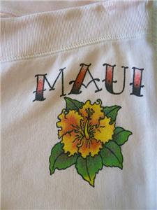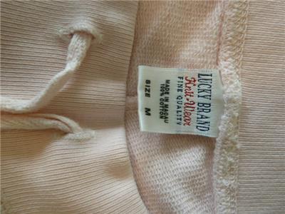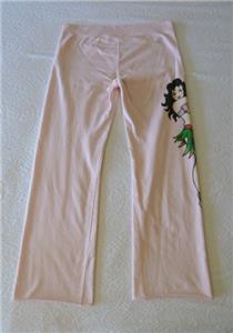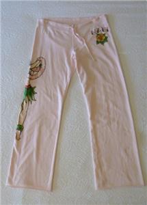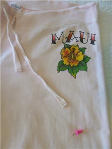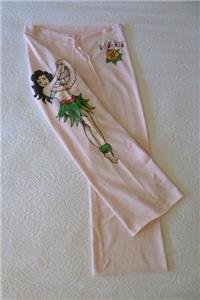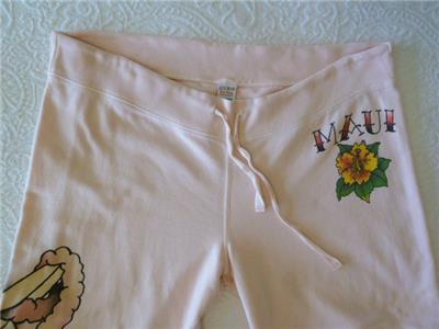 Very rare art-to-wear sweatpants from LUCKY BRAND, tag size M, measurements below. 100% cotton "Knit-Ware", machine wash and dry. From Holiday 2004 in excellent condition, just one tiny nick (see photos 11 and 12). Otherwise, like new. Pale pink, "MAUI" and hibiscus flower at your left hip, a pinup hula girl along the opposite leg. Full-leg pants have drawstring waist on the ribbed yoke, raw-cut rolled hem. Review all photos to fully appreciate.