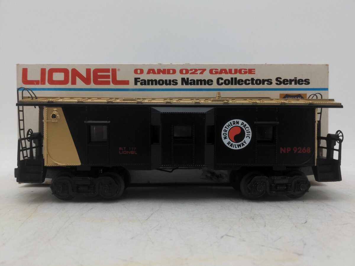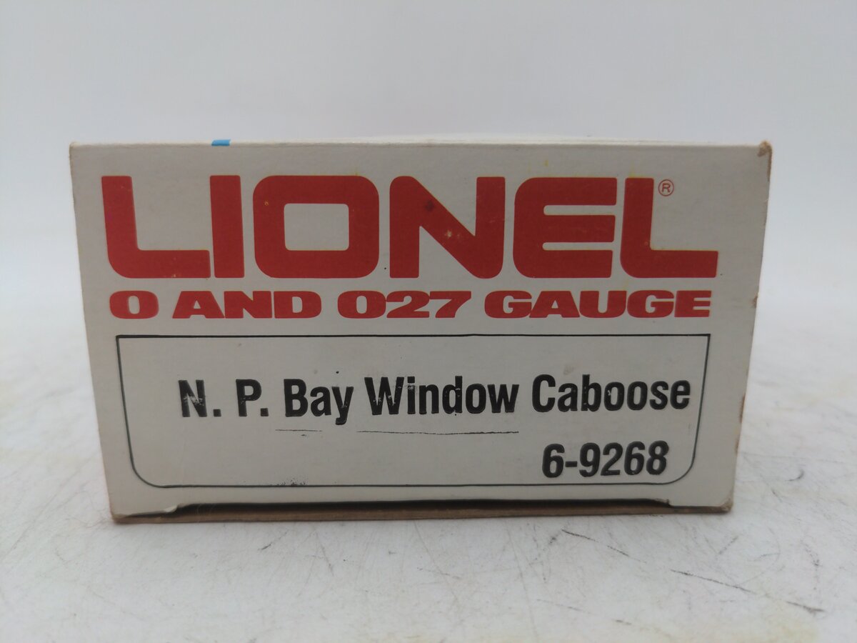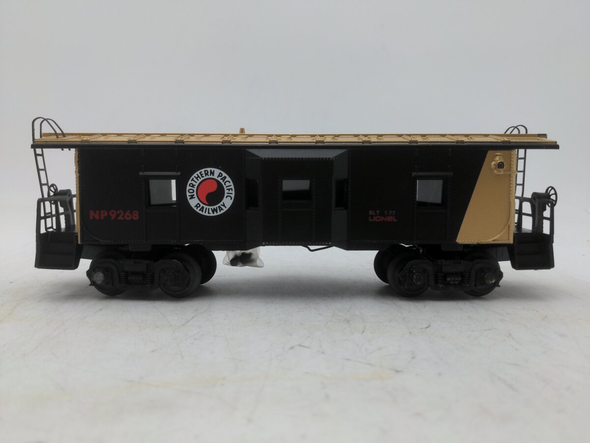 Here is a Lionel 6-9268 O Gauge Northern Pacific Bay Window Illuminated Caboose from 1977. This car has a bit of an interesting history. Originally, Lionel made the 1976 Northern Pacific Service Station Special set with a 9177 NP Caboose in prototypical green and yellow markings. However, many collectors complained that it did not match the 8666 GP-9 Locomotive, so Lionel made the 9268 the following year as an add-on to the set to match the engine. This car was never in the regular Lionel catalog and is somewhat hard to find. This caboose features interior illumination, die-cast metal trucks, die-cast metal operating knuckle couplers, metal wheels and axles.