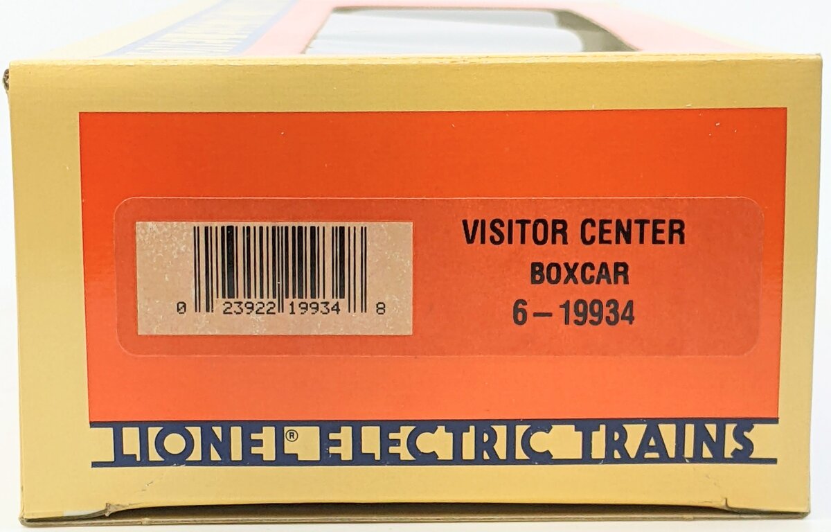 This is a Lionel 6-19934 O Gauge Visitors Center Boxcar from 1995. This boxcar features sliding doors, plastic trucks, operating knuckle couplers, metal wheels and axles.