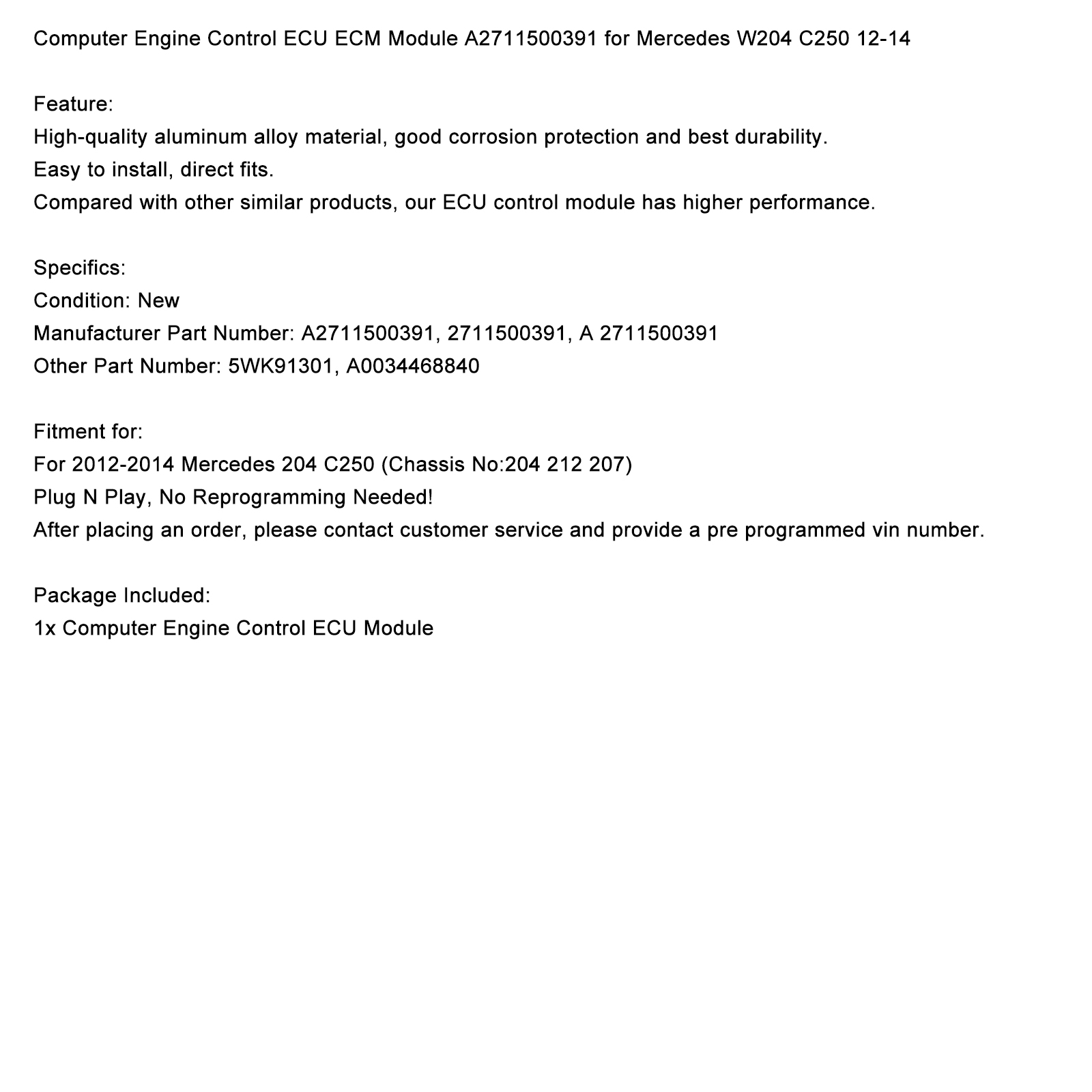 Computer Engine Control ECU ECM Module A2711500391 for Mercedes W204 C250 12-14