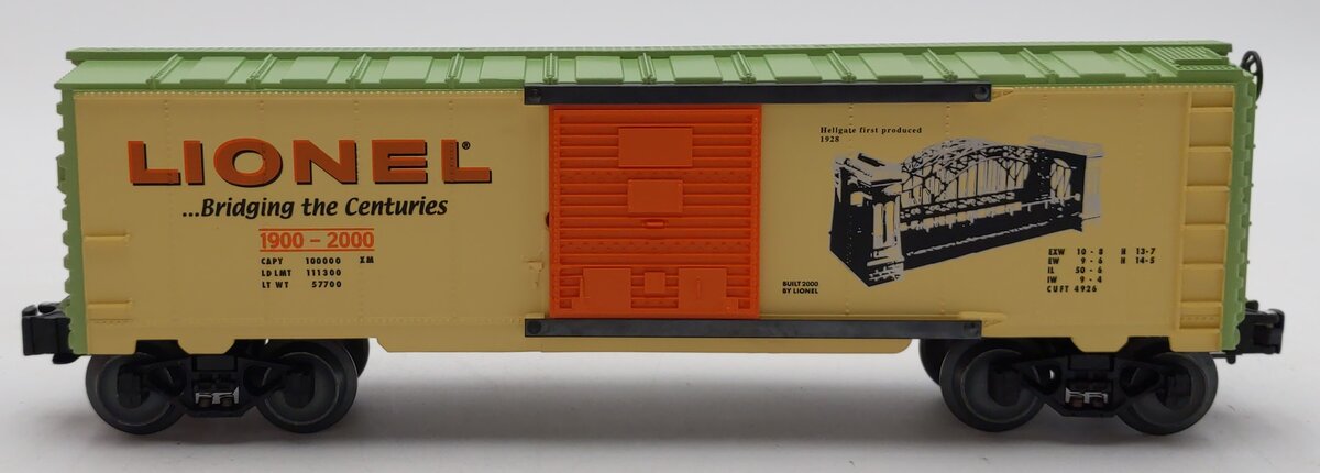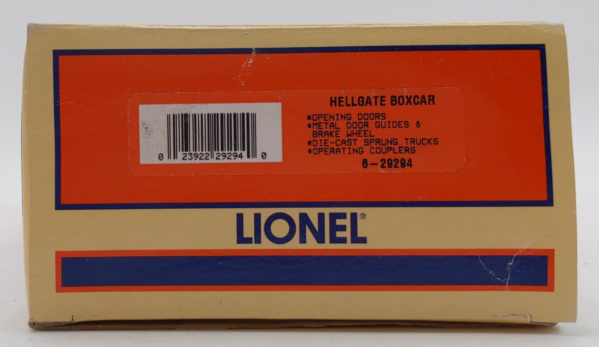 Here is a Lionel 6-29294 O Gauge Hellgate Bridge Boxcar from 1999. This car features sliding doors, die-cast metal sprung trucks, die-cast metal operating knuckle couplers, and metal wheels and axles.