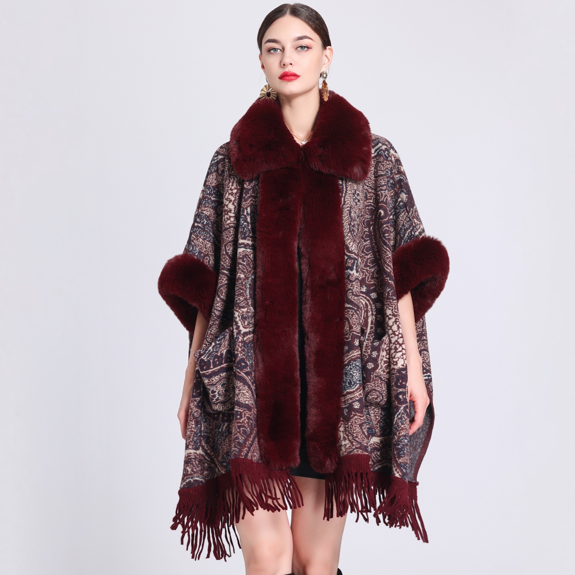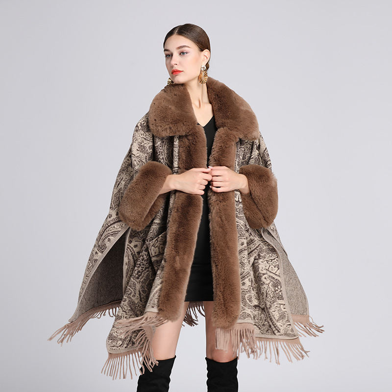 Faux Rex Rabbit Fur Collar Shawl Cape Jacquard Loose Fringed Woolen Coat Women