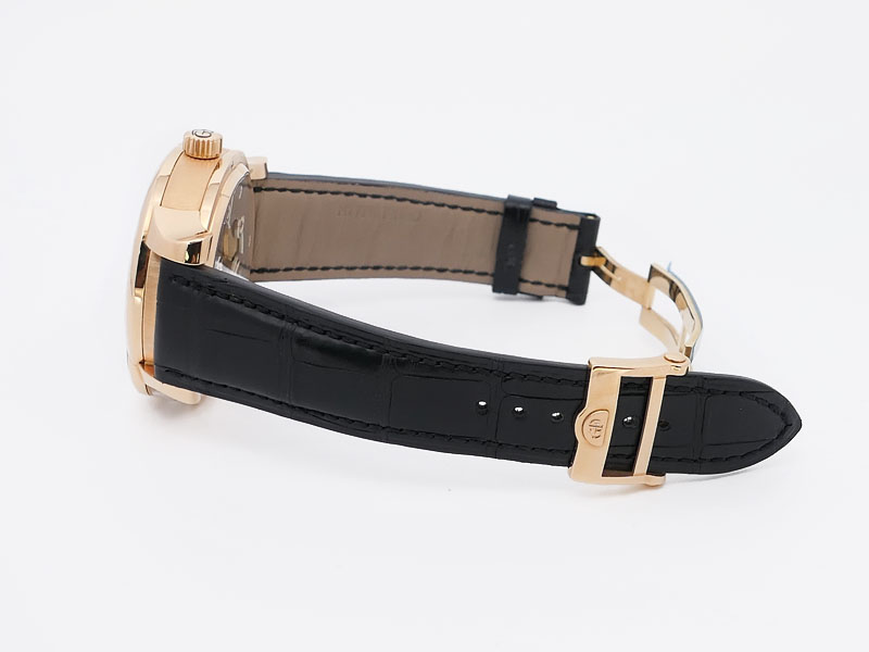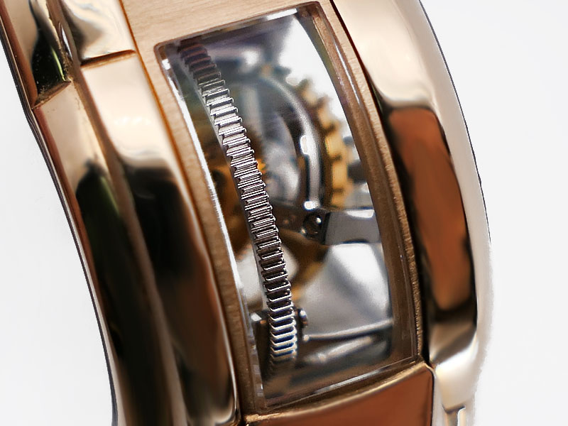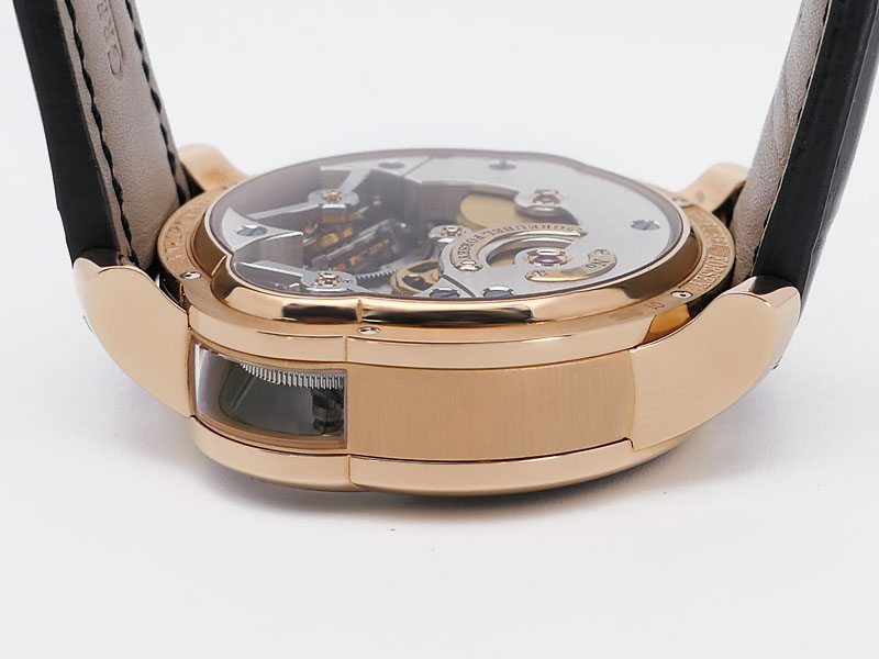 lateral window with shaped sapphire crystal 3 dimensional case measuring 43.5mm diameter. Fixed 18k Red Gold polished bezel and centre