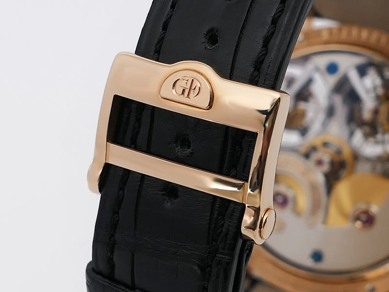 Sapphire crystal, caseback. Black leather hand-sewn strap with folding, engraved with the Greubel Forsey logo Deployment Buckle,. Water