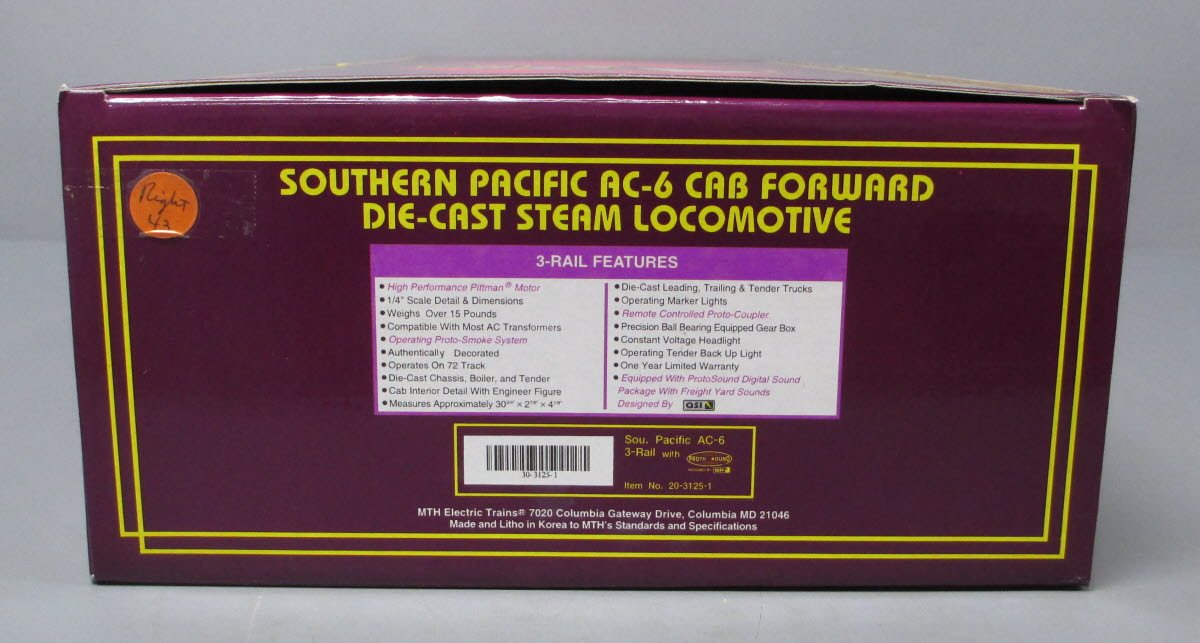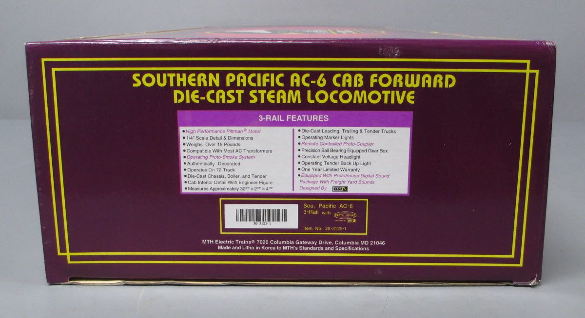 This is a spectacular MTH 20-3125-1 O Gauge Southern Pacific AC-6 4-8-8-2 Cab-Forward Steam Locomotive and Tender #4126 with PS1. from 1998. Features include a high performance Pittman motor, an operating ProtoSmoke system, a remote controlled proto-coupler and it is equipped with ProtoSound digital sound package with freight yard sounds designed by QSI.