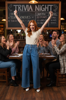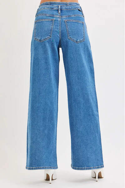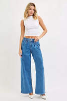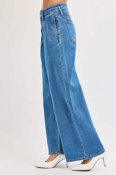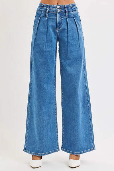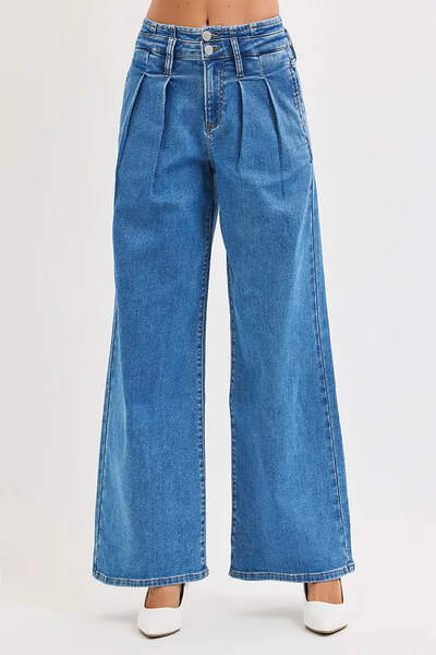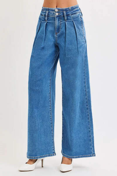 A: These RISEN wide leg jeans feature elegant pleated details and a mid-rise fit that's professional enough for business casual while still being comfortable for all-day wear.