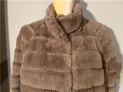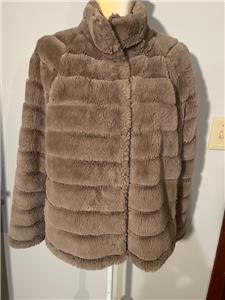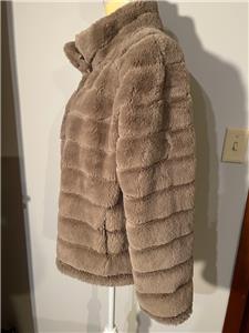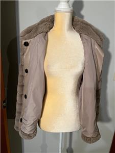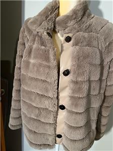 This sale is for a Rino & Pelle Beige / Tan Faux Fur Jacket in Size Medium. This jacket has a beige faux fur shell..soft and comfortable! There are 4 large snaps for closure on front with hidden snaps at the neck. There are 2 slit side pockets ....see photos for exact condition! This jacket is in excellent condition ... (see photo).......please check measurements below since there is no size tag but pretty sure it is a medium!!!