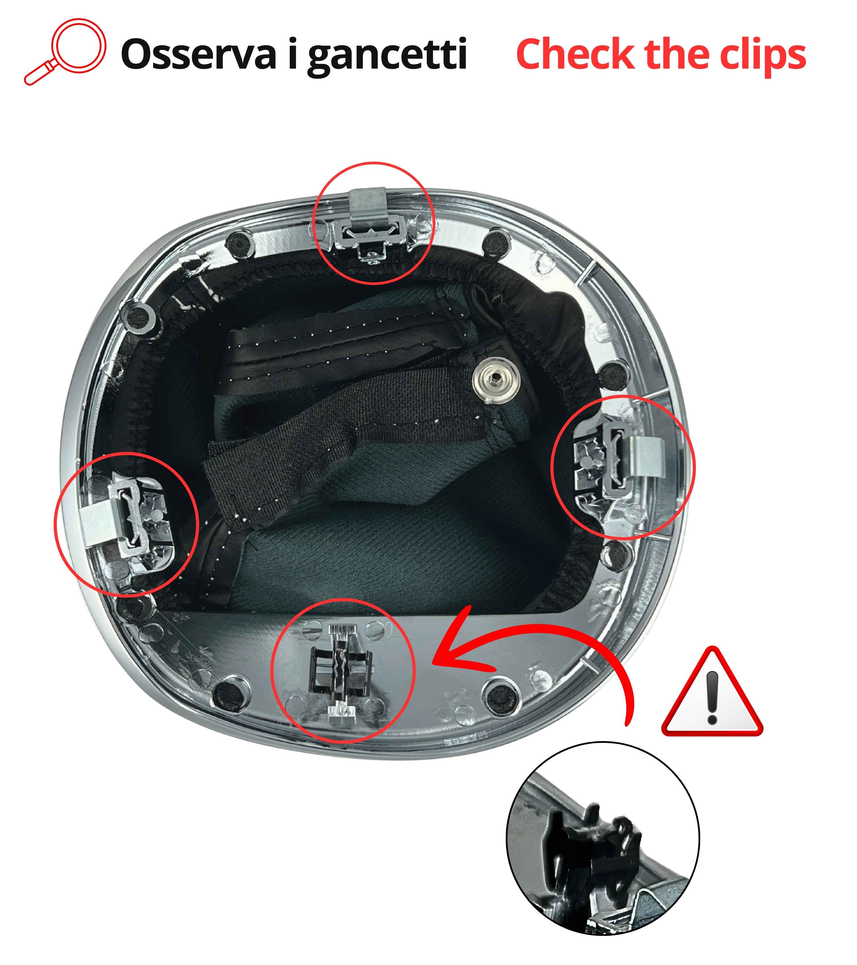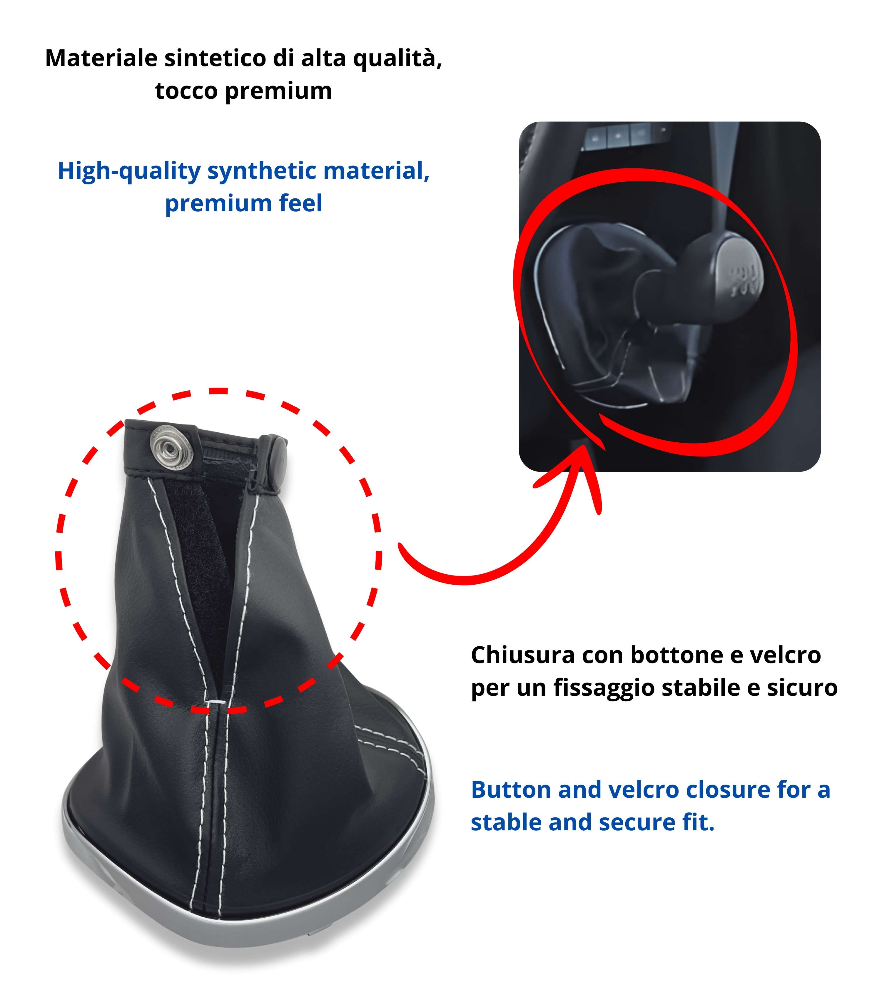 Basta rimuovere la vecchia cuffia e sostituirla con la nuova, agganciando la cornice premontata direttamente alla plancia del cambio. Non servono modifiche né strumenti particolari.