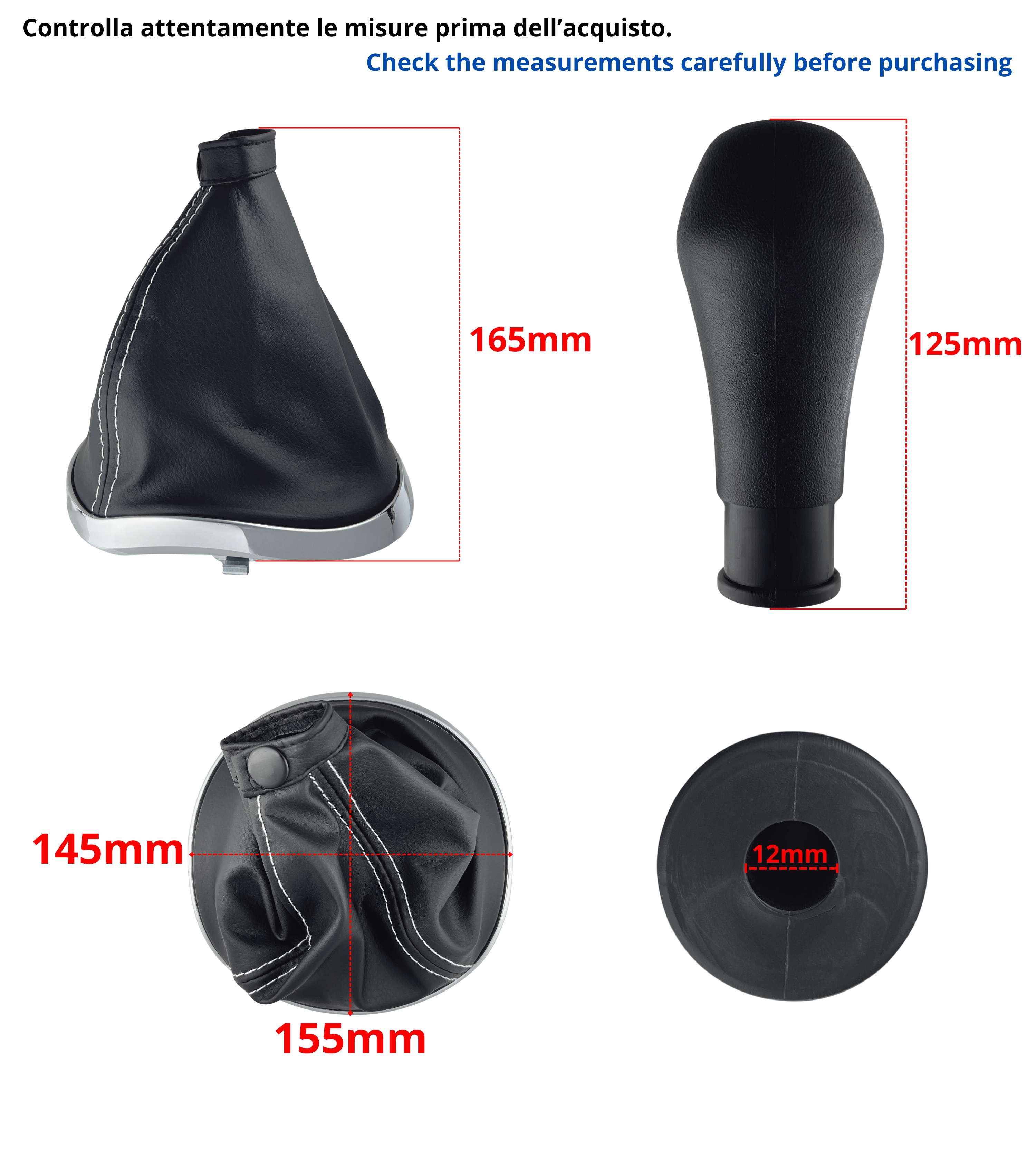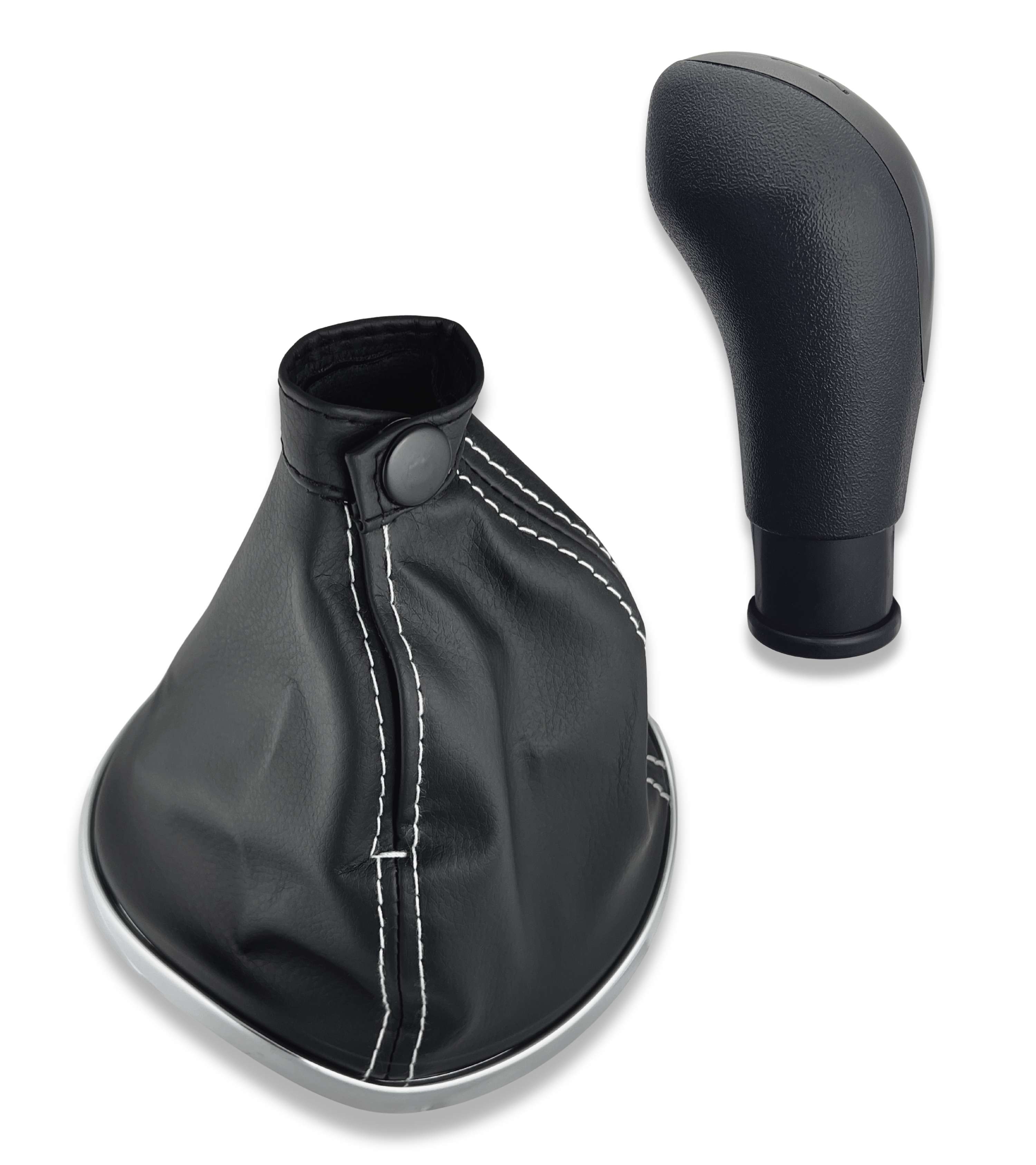 Kit completo composto da pomello 5 marce e cuffia nera con cuciture bianche con cornice e telaio interno integrati, compatibile con Lancia Ypsilon (843) prodotte dal 2003 al 2011. Una soluzione pratica per sostituire un vecchio pomello e una cuffia usurata, migliorando l’estetica e la funzionalità dell’abitacolo.
