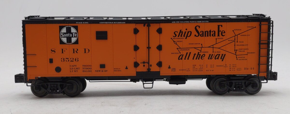 Here is a Lionel 17351 Santa Fe Steel Sided Reefer. It features scale proportions, separately applied detail parts, die-cast metal sprung trucks and operating couplers, a hidden uncoupling tab, metal underframe details, opening roof hatches with props and opening side doors. It measures 11 1/2 inches long. Road number 3494.