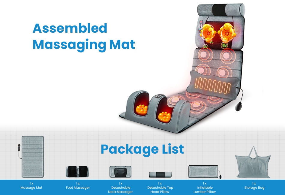 - Perfect Gift & Easy To Store/Carry: The full body massaging mat with neck massage, foot massage, head pillow and inflatable lumbar pillow is great to be used at home or in the office. It's a perfect gift for your grandparents,parents,husband,wife or friends in Mother’s day,Father’s day or birthday. With a carry bag with handles,simply detach all parts,fold it up and store it into the included bag for quick storage and easy carrying. Plus:If you feel noisy when massaging,you can use our included earplugs.