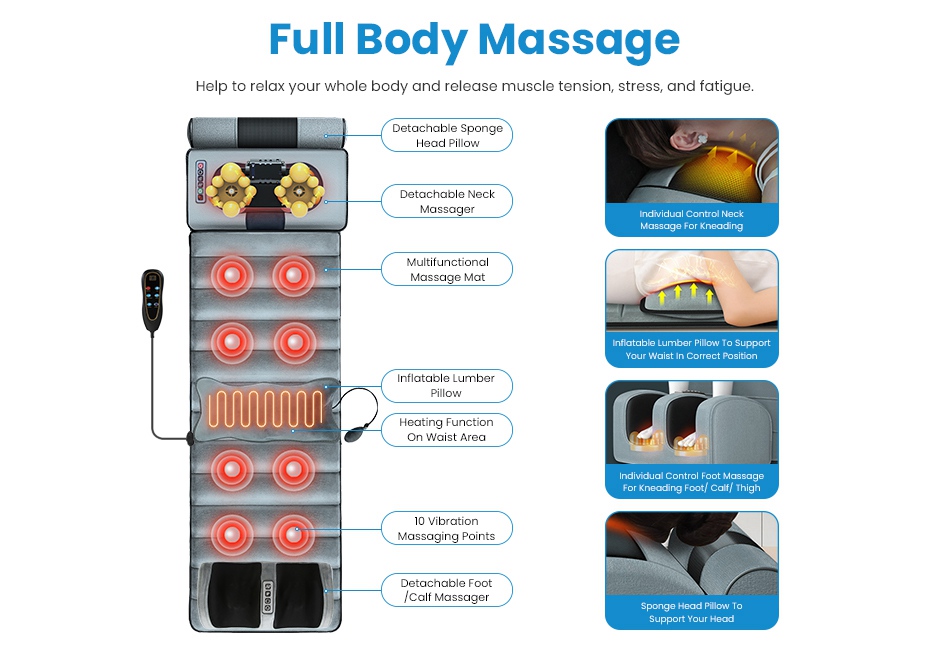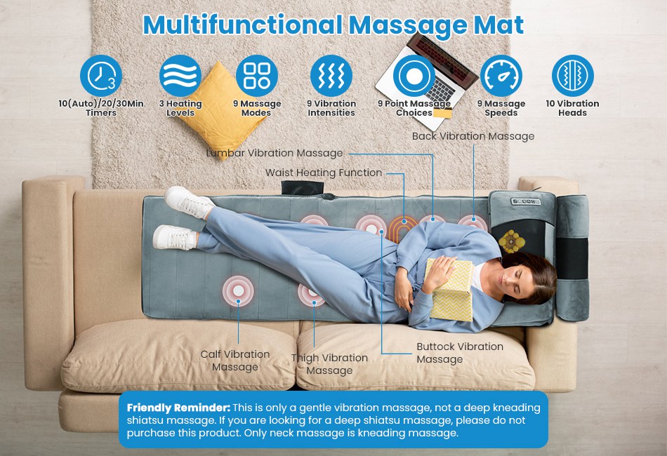 - Multifunctional Massage Mat:Our full body massage mat features 10 massage points including Back,Buttock,Waist,Thigh,Calf,and heating therapy function on lumbar zones,it's able to give you a therapeutic massage that helps release tension, stress, and fatigue after a long work day. You can choose 9 designated vibration modes, 9 point-selection vibration modes, 3-level heating levels and enjoy full control over 9-level vibration intensity and 9-level speeds as you hit all the right spots.