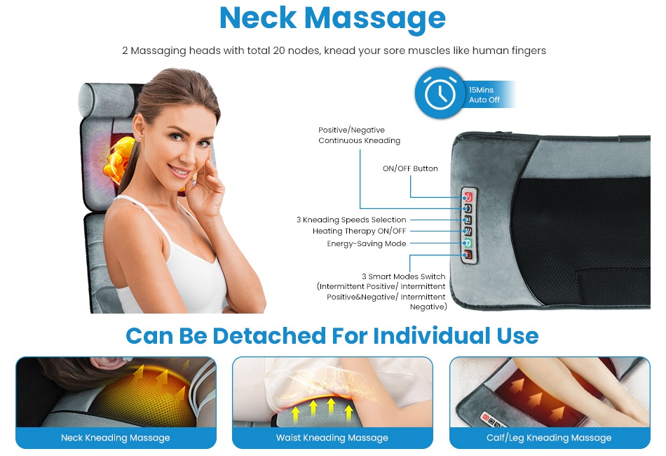 - Detachable Neck Massager & Head Pillow: A neck massage is provided to knead your neck to relieve your neck pain and stiff neck muscle. With 2 kneading heads with total 20 nodes, which can grasp, knead, press your sore muscles like human fingers. You can choose positive or negative direction of kneading, energy-saving modes or smart modes including 3 kneading patterns as you like. 3 Selectable speeds meet your diverse demands. It also builds in heating infrared light to bring warmth to your muscle and result in speeding up blood circulation on your neck. Extra detachable head pillow filled with soft sponge helps to support your head. Comes with a pillow cloth with fixing straps to cover on the neck massager for using, ensuring easy maintenance.