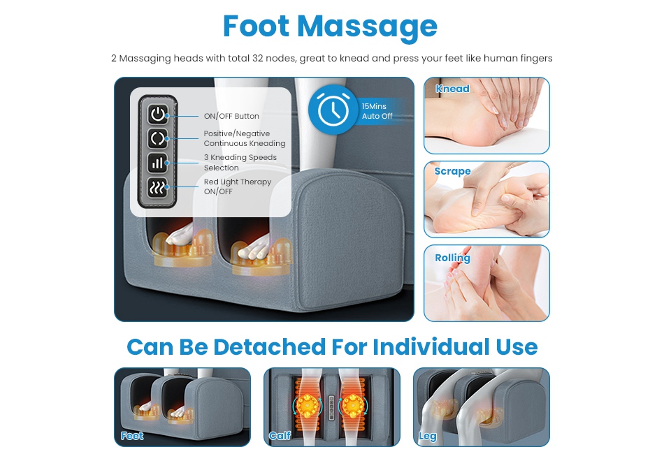 - Foot Massage Function: Kneading(Positive&Negative Continuous Kneading, 3-Level Speed); Heating Function; 15Min Auto-Off Timer