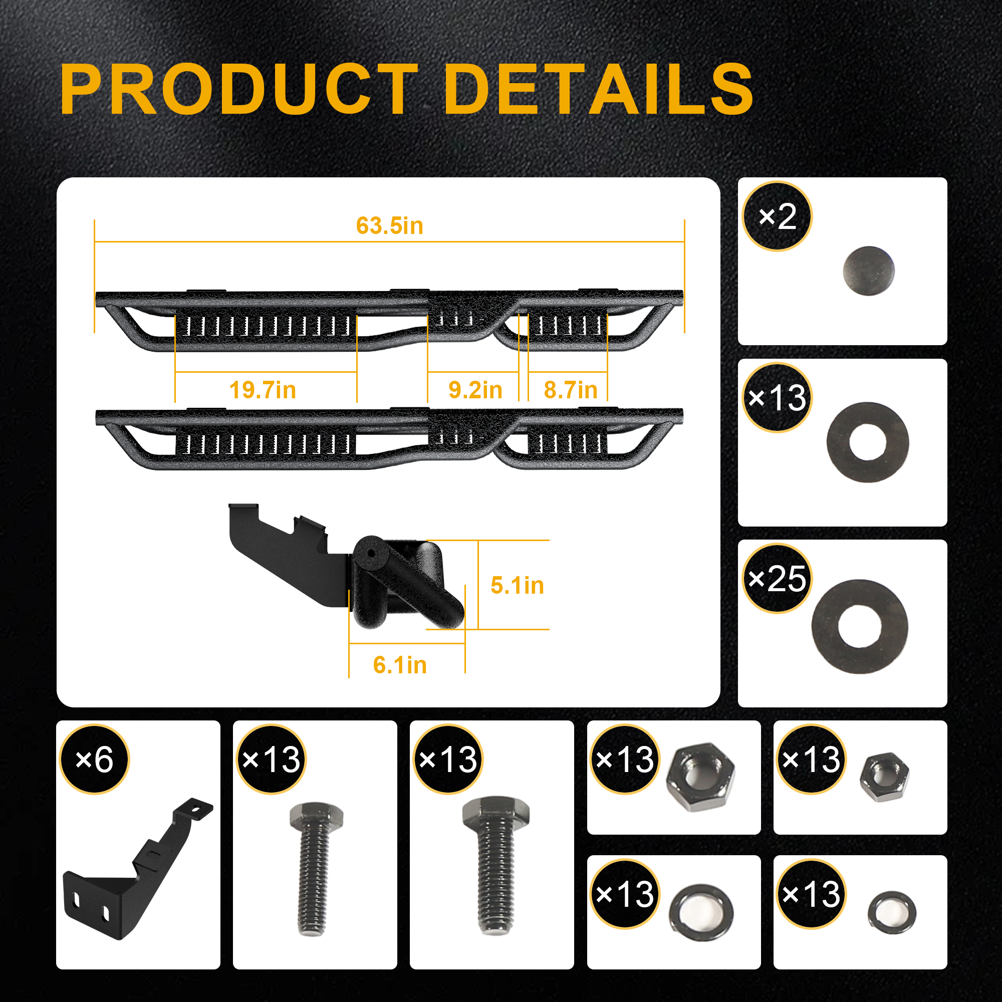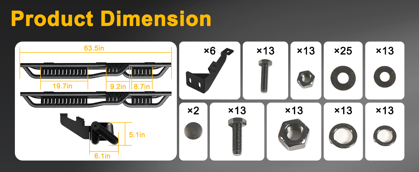 | 6.1 inch wide drop down step pad for great accessibility for pickup trucks with lift kits and oversized wheel tires keep enough ground clearance. | Direct replacement and bolt-on installation. No drilling or cutting is required (Professional installation is highly recommended). |