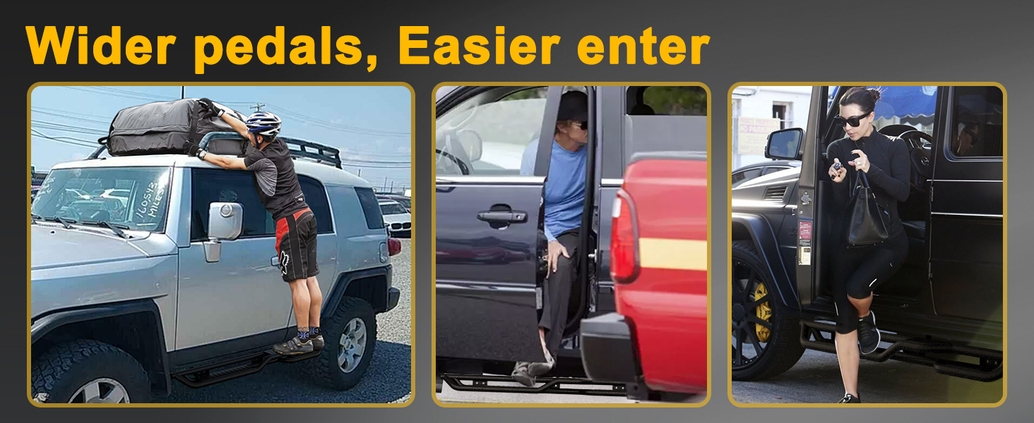 | Made of high-grade sturdy steel which offers the best in durability and strength. Unique powder coating offers exceptional rust and corrosion resistance so you can drive under any condition. | The laser cutting step plate achieves a non-slipping step surface and reinforced grip. Each step bars proven to handle up to 500 lbs without bending. |