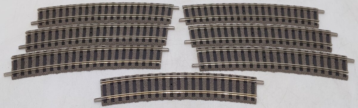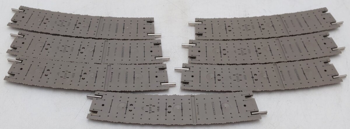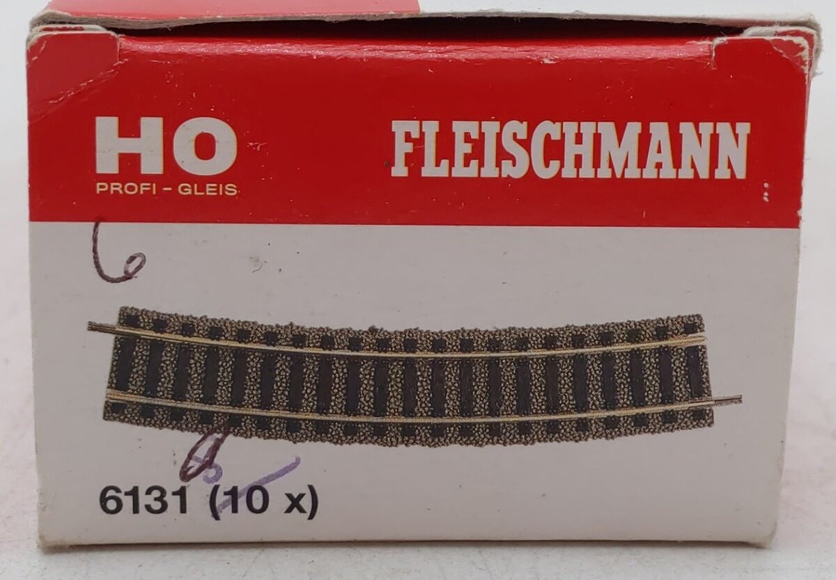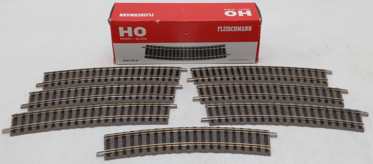 Here is a Fleischmann 6131 HO Profi-Track Curved Track 18° Ballasted (Box of 7). This item plastic construction and metal railing.