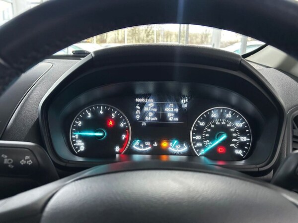 This 2019 Ford EcoSport Zetec boasts a clear vehicle history, offering you peace of mind. This 1.0L petrol model, registered in 2019, is a Euro 6 compliant vehicle. It comes equipped with manual air conditioning for your comfort and the Ford SYNC 2.5 system, featuring an 8 inch touchscreen that seamlessly integrates with Android Auto, Apple CarPlay, and Bluetooth connectivity. With an impressive fuel economy of 44 mpg, this EcoSport demonstrates its efficiency compared to other vehicles in its class. Its low CO2 emissions further highlight its environmentally conscious design. This Ford EcoSport Zetec provides a practical and well equipped driving experience. Welcome to MotorTrustUK, where exceptional standards and customer satisfaction are at the forefront of our service. All of our retail vehicles undergo a rigorous 128-point mechanical inspection, independently carried out by a qualified AA technician, to ensure the highest level of reliability and safety. Should any vehicle have less than six months remaining on its MOT or be due a service, these requirements will be addressed prior to delivery. For added reassurance, we include a complimentary nationwide warranty with all qualifying vehicles. With approximately 1,500 vehicles currently in group stock, a number that continues to grow, we are pleased to offer part exchange services, accept all major credit and debit cards, and provide flexible finance options, including HP, PCP, and subprime solutions. Nationwide delivery can also be arranged by quotation. While every effort is made to ensure accuracy in vehicle specifications and descriptions, details may vary; we encourage all customers to speak with a member of our sales team to confirm key information such as MPG figures, available keys, or any factory modifications. To ensure smooth processing and support, an administrative fee is applied to all completed sales. We look forward to assisting you in finding your next vehicle with confidence at MotorTrustUK. .16in Alloy Wheels - 5 Spoke Magnetic, Adjustable Boot Load Floor, Airbags - Curtain, Airbags - Driver and Front Passenger, Airbags - Drivers Knee, Airbags - Front Passenger De-Activation Switch, Alarm - Thatcham Category 1 with Volume Sensing and Perimeter, Analogue Instrument Cluster, Anti-Lock Braking System - ABS with Electronic Stability Control - ESC, Centre Console with Cup Holder, Child Locks, Chrome Headlight Bezel, Courtesy Light - Front with Two Map Lights, Courtesy Light - Rear, Door Frame Beltline - Black, Door Handles - Body Colour, Door Mirrors - Body Colour Housing, Door Mirrors - Electrically Operated and Heated, Driver Seat Manual Height- Fore/Aft and Seatback Angle Adjustment and Recliner, Driver Seat Manual Rotary Knob Lumbar Support Adjustment, Driver and Passengers Sun Visor with Covered Vanity Mirror and Ticket Strip on Drivers Side, Drivers Stowage Glovebox, EPAS - Electric Power Assisted Steering, ESP - Electronic Stability Programme with Hill Launch Assist, Emergency Assistance, Engine Immobiliser, Ford Easy Fuel - Capless Refuelling System, Ford SYNC 2.5 with 8in Touchscreen, Front Fog Lights and Turn Indication Light Bezel - Black, Front Fog Lights with Combined Turn Indication Light, Front Grille - Chrome, Front Seat - Passenger Manual - Fore-Aft and Recline Adjustment, Front Seat - Under Passenger Seat Stowage, Front Seats - 2-Way Head Restraint Up-Down, Front Seats - 3 Point Seat Belts with Load Limiter and Seatbelt Height Adjust, Front Seats - Seat-Back Map Pockets, Front Suspension - Independent with MacPherson Struts and Anti-Roll Bar, Front and Rear Bumper - Body Colour with Dark Insert, Front and Rear Floor Mats, Front and Rear Folding Grab Handles, Front and Rear Power Points - 12V, Full Length Overhead Console with Sunglasses Holder, Gear Shift Indicator, Gearshift Knob - Black Insert and Chrome-Finish Ring, Glovebox with Cool Bin - Lid and Illumination, Halogen Rear Lights, Handbrake Grip - Leather-Trimmed, Headlights - Courtesy Delay, Headlights - Levelling Control, Headlights - Projector Beam Headlight with LED Daytime Running Lights, Height Lumbar Adjustment on Drivers Seat, High Mounted Brake Light, IPS - Intelligent Protection System, Leather Handbrake and Gearknob, Load Compartment - Lights, Load Compartment Carpet, Load Compartment Side Trim Incorporating Shopping Hooks, Low Level Centre Console, Lower Body Side - Door Claddings - Black, Manual Air Conditioning, Manual Dimming Rear-View Mirror, Manual Parking Br