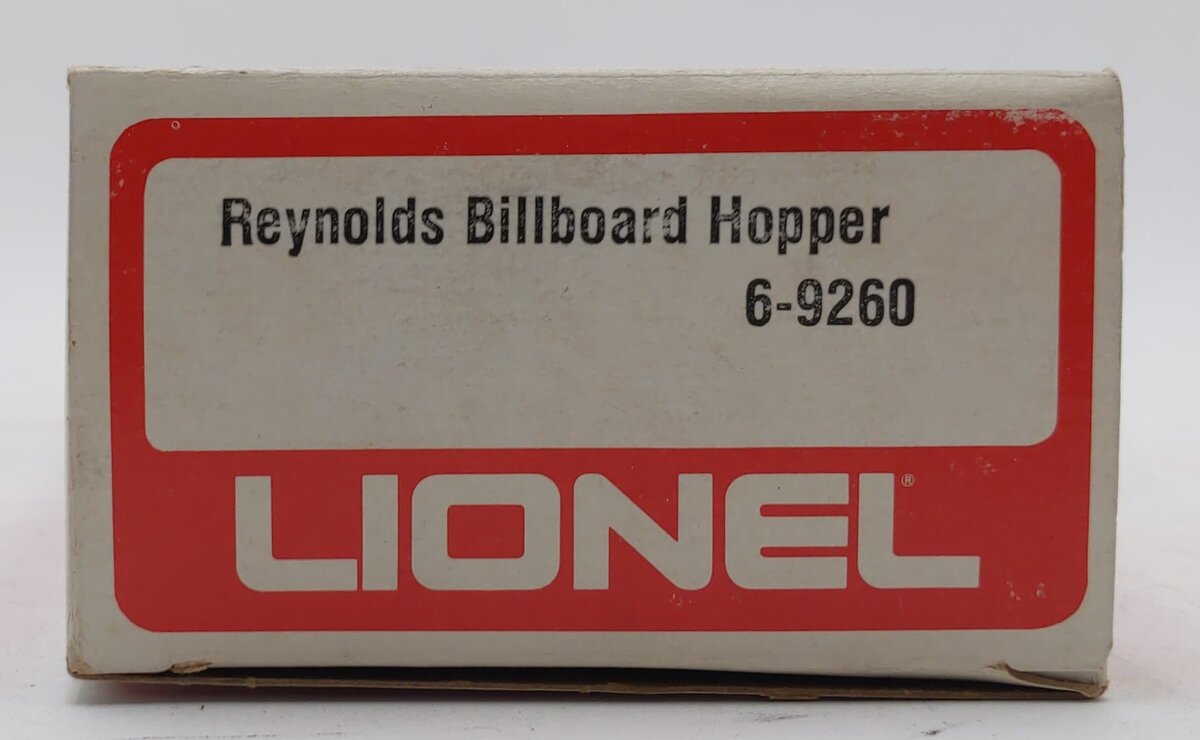 Here is a great Lionel 9260 Reynolds Billboard Hopper, built in 1975. It features opening roof hatches, plastic trucks, operating knuckle couplers, and metal wheels and axles.