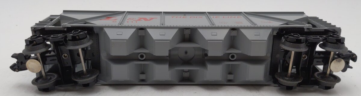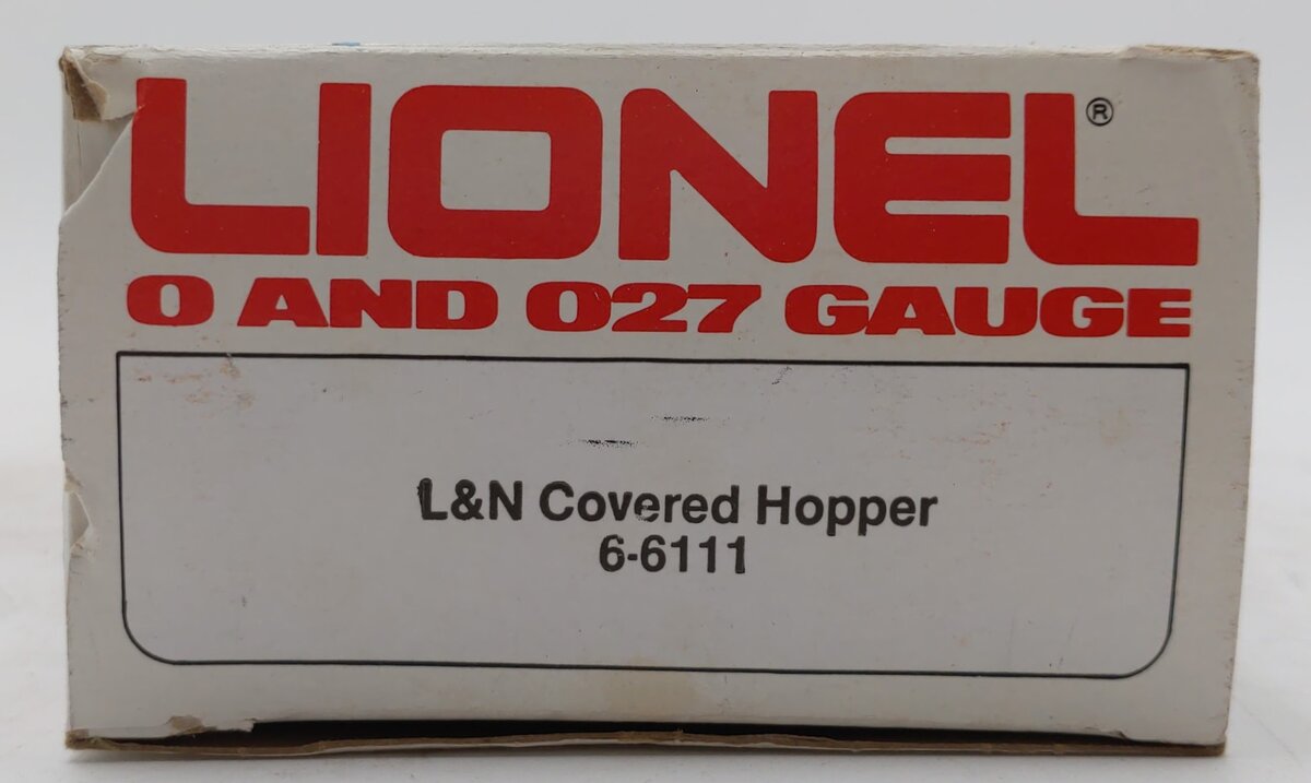 This is a Lionel 6-6111 O Gauge Louisville & Nashville Gray Covered Hopper. This car features plastic construction with a removable cover that has opening hatches, plastic trucks, operating knuckle couplers, metal wheels and axles, and attractive decoration.