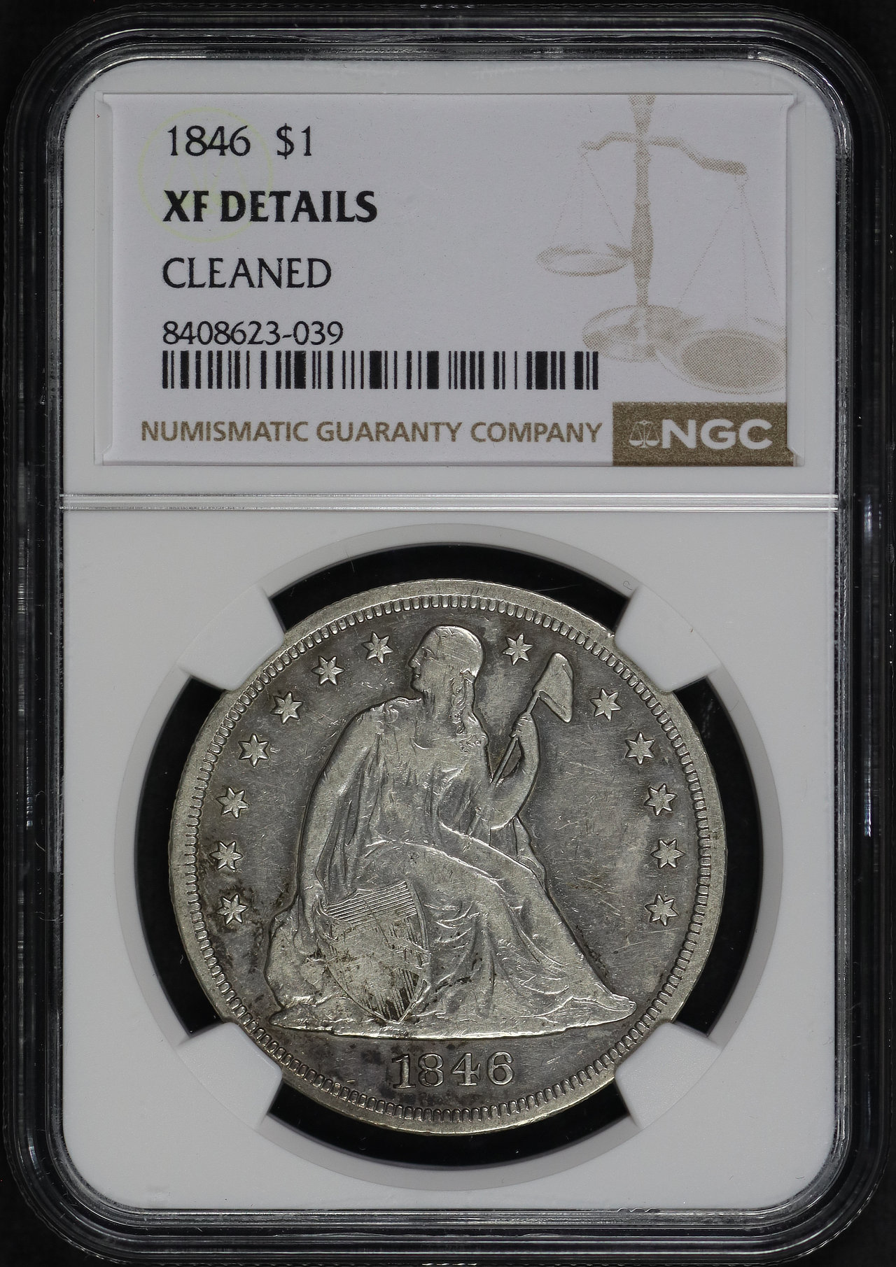 1846 Seated Liberty Dollar NGC XF Details Cleaned. This coin has the given grade as a result of it having been improperly cleaned, showing faint hairlines, dark discoloration, and glossy surfaces.