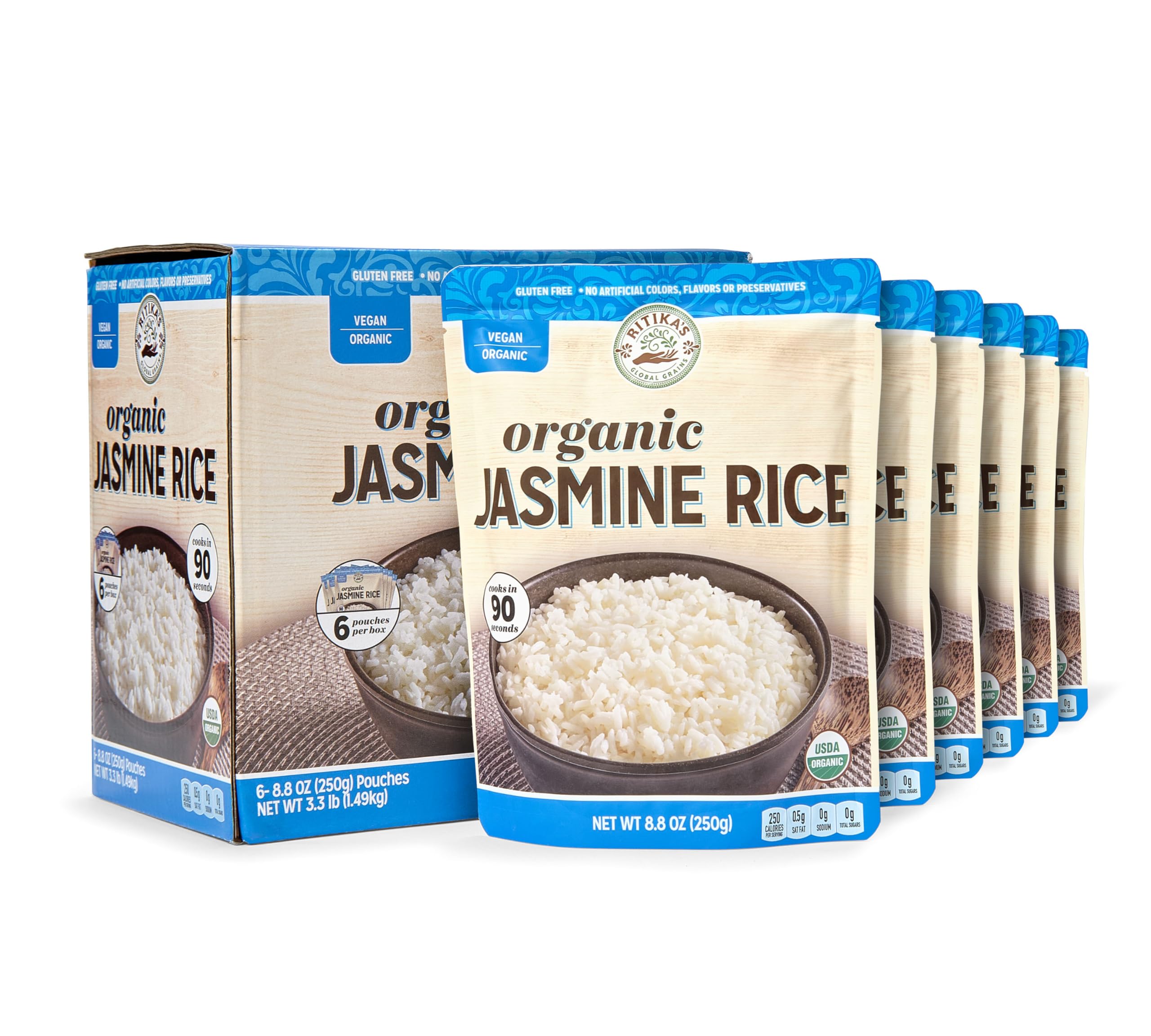Ritikas Global Grains Organic 90 Second Jasmine Rice Bring authentic flavor and convenience to your kitchen with Ritikas Global Grains Organic Jasmine Rice. Grown with care and naturally fragrant, this long-grain rice cooks to fluffy perfection in just 90 seconds. Each microwavable pouch makes mealtime easierwithout compromising on taste or quality. Ready in 90 Seconds Heat, serve, and enjoy; no soaking, rinsing, or boiling required. Organic & Non-GMO USDA Certified Organic jasmine rice, grown without synthetic chemicals. Wholesome & Gluten Free Pure jasmine rice with no artificial flavors, preservatives, or gluten. Perfect Portions Six convenient 250g pouches; ideal for single servings, family meals, or meal prep. Versatile Meal Base Pair with curries, stir-fries, grilled meats, or plant-based dishes for a complete and satisfying meal. Whether you need a quick lunch, a healthy side, or a base for your favorite recipes, Ritikas Global Grains Organic Jasmine Rice delivers consistent flavor and fluffy texture every timeall in under two minutes.