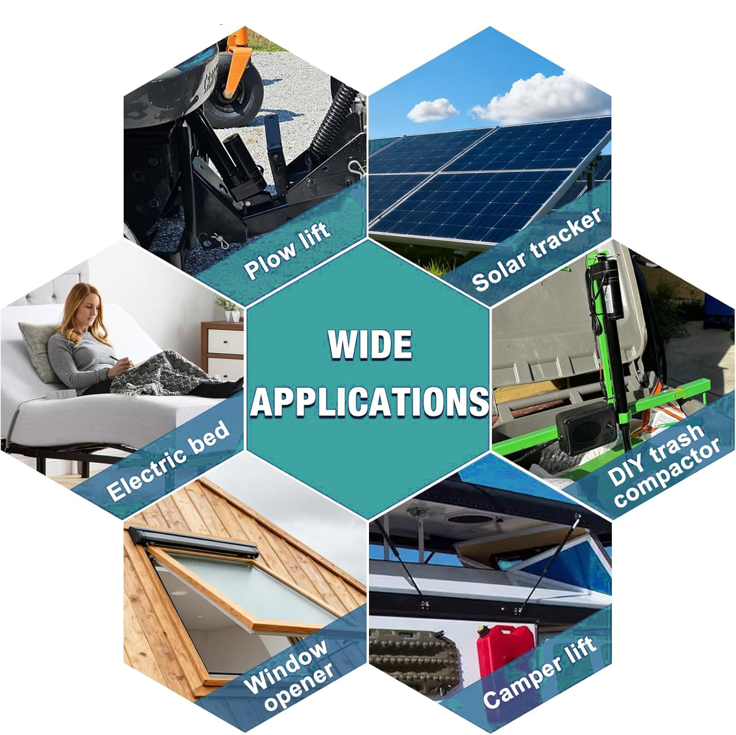 WIDE APPLICATION-- Linear actuator can be widely used in automotive, medical devices and engineering industry, agricultural machinery, wedding system, industrial electric lifting system, medical electric bed, surgical bed, traction bed, electric sofa, electric lifting lever, electric booth, electric sunroof, electric wheelchair and more.