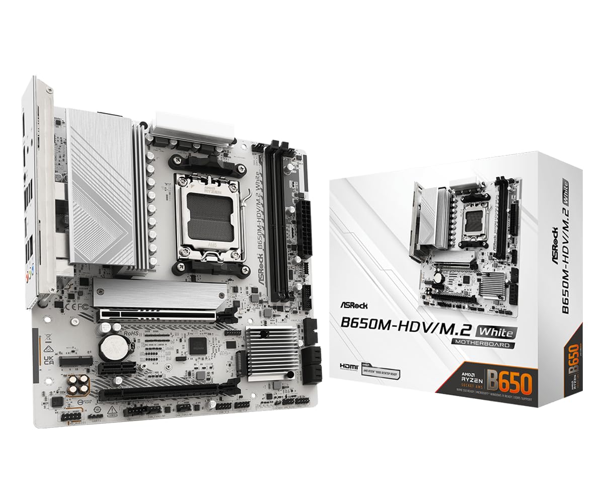 Unlock the power of AMD's AM5 platform with the ASRock B650M-HDV M.2 White motherboard. Engineered for Ryzen 9000, 8000, and 7000 Series processors, its robust 8+2+1 phase Dr.MOS power design ensures stable performance for gaming and productivity. Dual DDR5 DIMM slots support speeds up to 8200+ (OC), while versatile graphics outputs (HDMI, DisplayPort) cater to modern displays. Experience next-gen expansion with a primary Blazing PCIe 5.0 x16 slot for flagship GPUs, plus secondary PCIe 4.0 slots and an M.2 Key E for WiFi flexibility. Maximize storage potential with a cutting-edge PCIe Gen5x4 M.2 slot and a PCIe Gen4x4 M.2 slot, delivering blistering SSD speeds alongside four SATA3 ports for HDDs. Connectivity excels with front/rear USB 3.2 Gen2 Type-C ports, six USB 3.2 Gen1 ports, and eight USB 2.0 ports. Enjoy high-fidelity audio via the Realtek ALC897 7.1-channel codec enhanced by Nahimic, plus ultra-fast networking via Realtek 2.5G LAN. Designed for builders seeking style and value, this Micro-ATX board features a distinctive white PCB ideal for themed builds. Essential features like BIOS Flashback ensure hassle-free updates, making it perfect for gamers, creators, and compact system builders demanding modern features at an accessible price point.