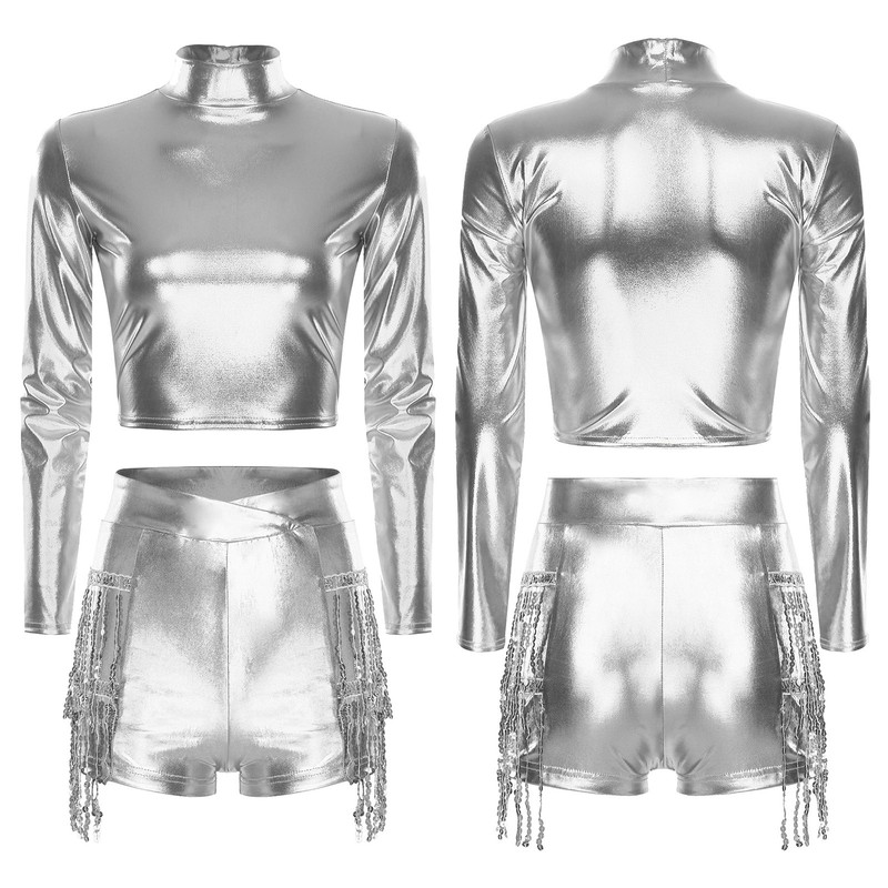 The metallic shiny finish of the crop top and shorts is on-trend, making you stand out in the crowd and adding a touch of glamour to your look.